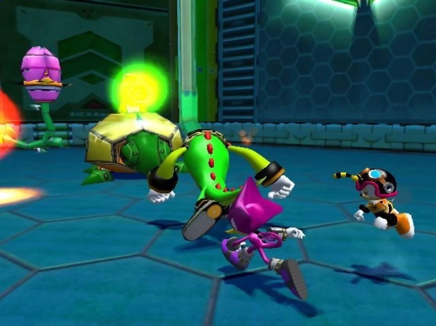 - La Chaotix team : Espio court et lance des shurikens, Vector tape fort et Charmy Bee vole et fait éclore des fleurs. Vous ne les connaissez peut être pas et c’est normal, ils n’ont fait que de brèves apparitions dans des jeux du genre Sonic en Espagne ou Sonic à la plage.