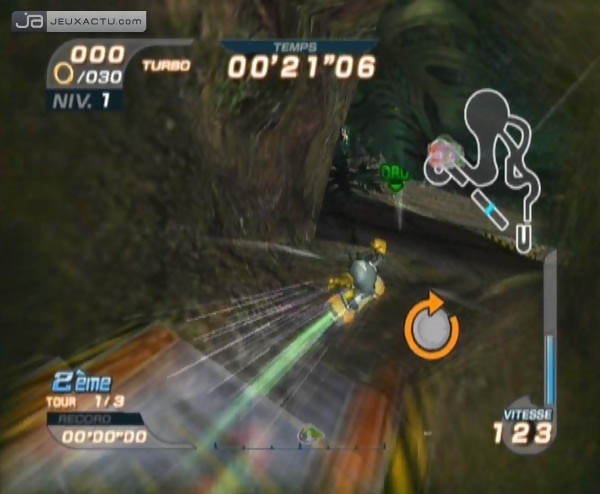 En faisant abstraction d’un scénario grotesque et prétexte à enchaîner toute une série de courses, Sonic Riders étonne avant tout pour sa rapidité. Ca va vite, très vite et le joueur à la recherche de sensations fortes y trouvera certainement son compte. Il existe plusieurs techniques pour atteindre une vitesse de folie et tutoyer le nirvana. Si les accélérateurs et autres bonus disséminés sur la route sont les moyens les plus simples pour faire grimper son compteur de vitesse, on s’intéressera davantage aux turbulences et aux tricks qui sont les éléments principaux pour rester en tête de la course. Passer dans une turbulence et profiter de l’air qui s’y engouffre permet en effet de dépasser un concurrent fingers in the noze si celui-ci a eu le malheur de passer à côté d’une turbulence. Montés comme des half-pipes, ces zones d’air nous donnent la possibilité de faire des figures sur les parois pour ceux qui maîtrisent un tant soi peu l’art de s’envoyer en l’air. Si le nombre de figures manquent singulièrement de variété, ils permettent néanmoins de gagner un peu de boost, une fois que la planche aura touché le sol. C’est un détail mais quelques secondes en plus peuvent faire la différence et permettre de doubler un concurrent sur le fil du rasoir. Dommage en revanche que le gameplay repose sur cette satané jauge d’air qui, une fois vide, nous oblige à continuer la course à pieds. Le cas échéant, il faudra impérativement trouver un moyen de remonter sur sa planche le plus rapidement, sous peine d’être largué par les autres coureurs ou tout simplement éviter que la jauge ne se vide trop rapidement. Pour ce faire, il ne faudra pas oublier de faire pivoter son stick analogique gauche lors de passages où le joueur perd la main, ou tout simplement continuer à exécuter des tricks. Ces derniers ne font d’ailleurs guère de cadeaux et rares sont les moments où ils se retrouvent coincés à un élément du décor (chose qui nous arrive assez fréquemment) puisqu’ils semblent prédisposés à gagner face aux joueurs. Cette difficulté mal dosée rend alors le jeu rapidement frustrant, à défaut d’être amusant.