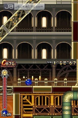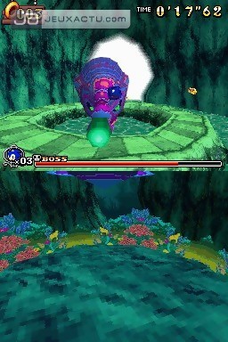 Inutile de tourner autour du pot pendant des heures, tout le monde connaît Sonic. Suite directe du premier opus paru il y a maintenant deux ans sur la portable au double-écran, Sonic Rush Adventure ne va pas chercher bien loin les bases de son gameplay. A vitesse grand V, il s’agira encore une fois de traverser les niveaux qui parsèment le jeu, et comme l’a instauré le premier Sonic Rush, ils occuperont les deux écrans en mêlant 2D classique et éléments en 3D. Signalons tout de même pour ceux qui l’ignorent encore que ces derniers font plus figure d’effets de style et que leurs apports ludiques relèvent de l’anecdotique. En parlant de style, Sonic bénéficie en toute logique de sa panoplie de mouvements : spin-dash, course sautée, double saut, jauge de turbo… Le tutorial en début de jeu se chargera de vous expliquer de manière concise et efficace de quoi il en retourne. De même, les boss s’inscrivent dans la tradition initiée il y a deux ans. Entièrement en 3D, ils jouissent d’une réalisation correcte, mais se démarquent surtout par l’originalité dont ont fait preuve les développeurs pour qu’on en vienne à bout. La réalisation est donc exemplaire, et seul le boss du bateau-pirate fait ramer étrangement la console.