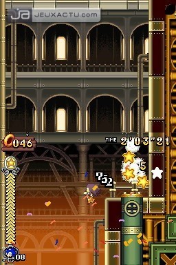 Inutile de tourner autour du pot pendant des heures, tout le monde connaît Sonic. Suite directe du premier opus paru il y a maintenant deux ans sur la portable au double-écran, Sonic Rush Adventure ne va pas chercher bien loin les bases de son gameplay. A vitesse grand V, il s’agira encore une fois de traverser les niveaux qui parsèment le jeu, et comme l’a instauré le premier Sonic Rush, ils occuperont les deux écrans en mêlant 2D classique et éléments en 3D. Signalons tout de même pour ceux qui l’ignorent encore que ces derniers font plus figure d’effets de style et que leurs apports ludiques relèvent de l’anecdotique. En parlant de style, Sonic bénéficie en toute logique de sa panoplie de mouvements : spin-dash, course sautée, double saut, jauge de turbo… Le tutorial en début de jeu se chargera de vous expliquer de manière concise et efficace de quoi il en retourne. De même, les boss s’inscrivent dans la tradition initiée il y a deux ans. Entièrement en 3D, ils jouissent d’une réalisation correcte, mais se démarquent surtout par l’originalité dont ont fait preuve les développeurs pour qu’on en vienne à bout. La réalisation est donc exemplaire, et seul le boss du bateau-pirate fait ramer étrangement la console.