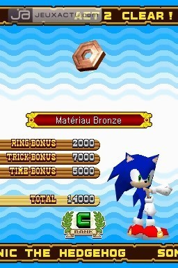 Après ces explications d’usage qui ne devraient pas vous en apprendre énormément, il est temps de lever le voile sur le terme “Adventure”. Si les sept mondes qui composent cet épisode - divisés en deux actes chacun pour autant de boss par contrées traversées - peuvent paraître un peu maigres, il faut reconnaître que la présence de ce mot dans le titre n’est pas juste le fruit du hasard. A la fin de chaque stage, une note est attribuée, allant du C - la plus mauvaise - au S la meilleure. Celle-ci prend en compte le temps nécessaire pour terminer le niveau, le nombre d’anneaux acquis et les points apportés par les tricks effectués. En fonction de cette note donc, une certaine quantité de matériaux vous est remis pour pouvoir construire des objets indispensables au bon déroulement du scénario. Et les principaux que vous avez à fabriquer constituent le principal élément nouveau de ce Sonic Rush Adventure. Il s’agit d’engins mécaniques marins. Le seul véritable problème à cette idée est que l’on sera forcé à recommencer certains niveaux pour acquérir la quantité suffisante de matériau pour leur construction. Jet-ski, bateau, aéroglisseur et sous-marin s’offriront à nos héros petit à petit en proposant chacun un gameplay différent et adapté à une maniabilité au stylet. Inutile de vous gâcher la surprise quant à leur fonctionnement, sachez juste que leur prise en main est particulièrement aisée, qu’ils apportent une variété, un fun et parfois un challenge vraiment appréciable. Ces engins vous serviront donc à parcourir le monde que les gars de chez Sega ont eu la bonne idée de créer. Comme dans le récent The Legend of Zelda : Phantom Hourglass, il faudra tracer votre itinéraire sur la carte pour y découvrir les terrains inexplorés, et c’est là que le titre nous pousse - gentiment - au voyage, les océans regorgent en effet de plus d’une dizaine d’îles cachés qui serviront à gonfler intelligemment une durée de vie que certains jugeront un peu juste, d’autant plus que ces niveaux bonus disposent d’un level design bien plus vicieux.