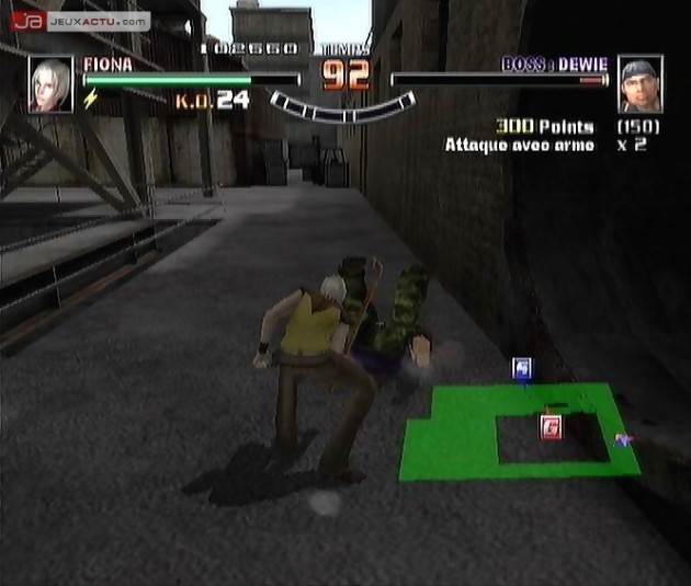 La descente aux enfers de Spikeout Battle Street commence peu après la scène d’introduction présentant l’histoire insipide du jeu. Une guerre des gangs fait rage sur l’île de Diesel Town depuis plus de dix ans. L’équipe Inferno s’est faite botter les fesses par les beaux gosses de la Team Spike. Mais son leader, Michael, est bien décidé à conquérir la ville et revient donc à la charge avec une armada de bad boys. Cependant, il va se heurter à un nouveau groupe dirigé par le fils du célèbre Spike répondant au nom de Spike Jr. Original vous avez dit ? Cette nouvelle équipe se compose de quatre protagonistes pas charismatiques pour un sou. Deux gars et deux gonzesses font office de protecteurs : Spike Jr, Min Hua, Jackal et Fiona. Chacun possède son propre style de combat. Boxe, combat de rue, Ba Ji Quan, mais la palme du meilleur style est décernée à Fiona. Il s’agit d’un ersatz de taekwondo, pour reprendre les mots de Sega : « coups de pied façon taekwondo ». Cela annonce bien l’aspect brouillon qui s’émane du titre. En effet, la maniabilité est loin, mais alors très loin, d’être exemplaire. Les personnages possèdent à tout casser une quinzaine de coups différents allant du simple bourre-pif aux projections et aux attaques spéciales. Les combos sont plus que simplistes puisqu’ils n’impliquent que l’utilisation de deux boutons. Par conséquent, les combos sont guère impressionnants car n’excédant pas les 6 ou 7 coups d’affilée. Grosso modo, on tapote comme un forcené les boutons X et Y en dirigeant le stick analogique vers l’ennemi le plus proche, sans vraiment prêter attention à l’action tellement celle-ci est mollassonne. Même les super attaques n’arrivent pas à nous procurer un soupçon de plaisir. Leur simple intérêt réside à se débarrasser des adversaires qui vous ont encerclés ou entamer de façon importante la jauge de santé des boss.