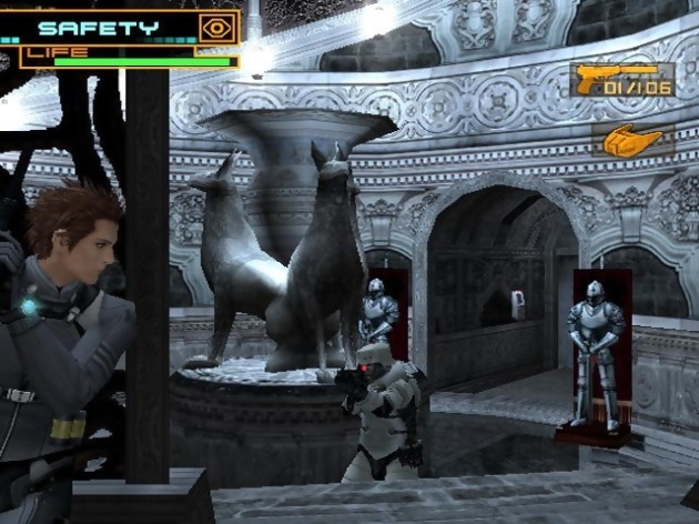 D’emblée, le joueur aura le choix entre deux espions : Billy et Sheila dont les différences se situent uniquement au niveau du sexe (NDRC : Mouais…). A aucun moment, l’un des deux personnages se démarquera de l’autre par des aptitudes spécifiques. Un choix de gameplay plutôt maladroit auquel de nombreuses incohérences viennent s’ajouter pour noircir un peu plus le tableau. Si l’intégration d’un système de déguisement dans le jeu est plutôt une bonne idée en soi, l’utilisation massive de ce festival de tenues vestimentaires handicape finalement un gameplay qui s’avère ultra dirigiste. A un problème posé, une seule et unique solution s’offre à nous et bien chanceux sera celui qui le trouvera dès le premier jet. Mais puisque l’intérêt de Spy Fiction repose sur l’art d’usurper l’identité d’autrui, un petit récapitulatif s’impose. Nos espions, qui disposent toujours de gadgets à la pointe de la technologie, se serviront d’un appareil photo pour copier intégralement l’apparence de leurs ennemis pris dans le cadre. Il suffira ensuite de trouver un coffre, un placard ou même une poubelle pour se jeter dedans et se changer illico presto. Mais voilà, c’est dans un fracas monstre que nos espions pénètrent à l’intérieur de ces planques sans jamais éveiller les soupçons des gardes alentour. Ces derniers sont totalement dépourvus d’I.A. et il leur faudra une bonne dizaine de secondes pour se rendre compte de votre présence, sans avoir besoin d’utiliser vos artifices. Idem pour l’alarme qui, une fois déclenchée, s’arrêtera d’elle même si vous restez caché, faisant ainsi disparaître tout méfiance de la part des gardes. Plutôt paradoxal pour un jeu qui met en avant son côté infiltration. La panoplie de gadgets de nos espions en herbe s’allonge avec l’utilisation du camouflage optique qui s’enclenche automatiquement dès que vous restez immobile contre un mur. L’effet spécial qui lui est attribué est plutôt sympathique mais on peut regretter tout de même de ne pas pouvoir l’utiliser comme bon nous semble, d’autant plus que le camouflage disparaît dès qu’on est en mouvement. Frustrant. Pour clore cet imparfait manuel d’espionnage, n’oublions pas l’ajout de ventouses qui permettent de se coller au mur dans une position plus qu’inconfortable et qui ne serviront que très peu finalement, étant donné l’intelligence plus qu’artificielle des ennemis.