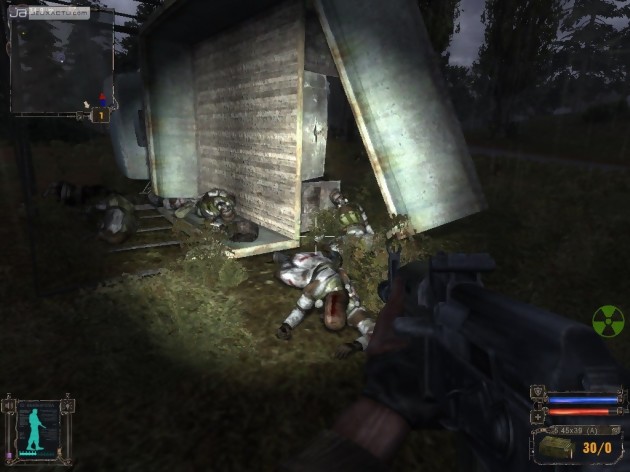 Si vous avez parfois besoin de ce genre de coups de pouce, c’est plutôt vous qui allez occuper la fonction d’homme providentiel. Certains habitants de la Zone ont en effet toujours quelque chose à vous demander, une mission à vous proposer. De la simple récupération d’un objet (perdu dans une zone malfamée) au nettoyage pur et simple (d’une zone malfamée) en passant par un échange de documents avec un individu isolé (dans une zone malfamée), chacun ira de sa demande particulière, vous promettant gloire, objets rares et argent en cas de réussite. Des récompenses qui vous seront bien utiles : reconnus par vos pairs, vous accéderez à des secteurs de plus en plus dangereux de la Zone ; riche, vous pourrez vous offrir le kit du parfait petit chasseur : munitions, médikits, armes d’assaut. Chaque Stalker possède en effet un sac à dos dans lequel il peut stocker de l’équipement. Des restrictions de poids vous empêcheront de vous trimballer toute une armurerie nord-américaine, mais vous aurez largement la place de conserver au chaud vos calibres préférés. Du moins au bout d’une demi-douzaine d’heures de jeu. Auparavant, vous devrez lutter contre les éléments à l’aide de vieilles pétoires capricieuse et redécouvrirez ce que c’est que de galérer dans un FPS.