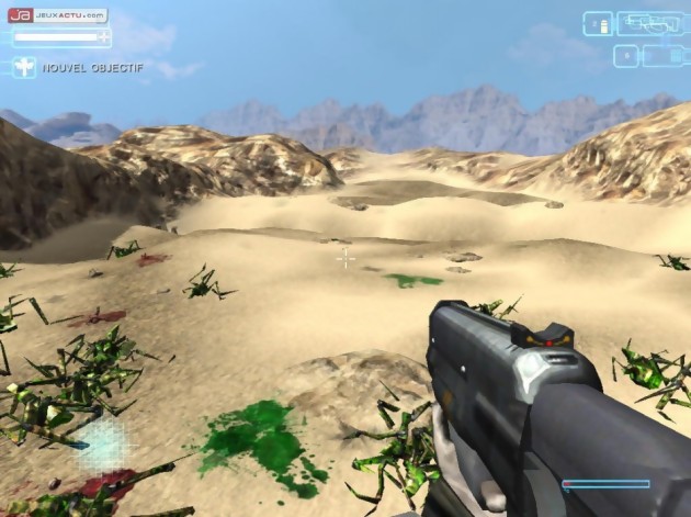Sur le papier, l'idée d'adapter Starship Troopers sur nos écrans de moniteur semblait bonne mais on pourrait malheureusement résumer le jeu en quelques mots : le tir à vue. Starship Troopers privilégie donc l'action pure et dure, illustrée par les flots continus de ces satanées bestioles qui nous obligent à maintenir constamment le doigt sur la gâchette. Amusant au départ, c'est tout de même un peu plat comme concept et surtout cela devient rapidement ennuyeux ! Conscient du problème, les développeurs ont tenté de briser un peu cette monotonie en nous garnissant de quelques objectifs à accomplir lors du briefing ou au cours de la mission. Il faudra notamment protéger une unité en particulier (troupe du génie ou officier gradé), escorter une escouade d'un point à autre ou encore tenir une position. C'est toutefois peine perdue et on pourrait se demander comment il pourrait en être autrement quand l'écran de statistiques oscille entre 1000 et 2000 insectes liquidés par mission. Un élément on ne peut plus négligé qui devient même une source d'ennuis lorsque l'on se fait littéralement submerger par un ennemi présent en surnombre. Tout devient alors terriblement confus – agrémentés parfois de problèmes d'affichage – et on ne comprend plus rien à la situation. Les bords de l'écran clignotent en bleu pour signaler que vos ennemis à huit pattes transpercent peu à peu votre armure et généralement, il faudra blaster dans tous les sens en espérant nettoyer la zone et y voir plus clair. Frustrant.