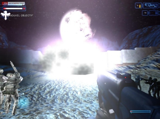 Sur le papier, l'idée d'adapter Starship Troopers sur nos écrans de moniteur semblait bonne mais on pourrait malheureusement résumer le jeu en quelques mots : le tir à vue. Starship Troopers privilégie donc l'action pure et dure, illustrée par les flots continus de ces satanées bestioles qui nous obligent à maintenir constamment le doigt sur la gâchette. Amusant au départ, c'est tout de même un peu plat comme concept et surtout cela devient rapidement ennuyeux ! Conscient du problème, les développeurs ont tenté de briser un peu cette monotonie en nous garnissant de quelques objectifs à accomplir lors du briefing ou au cours de la mission. Il faudra notamment protéger une unité en particulier (troupe du génie ou officier gradé), escorter une escouade d'un point à autre ou encore tenir une position. C'est toutefois peine perdue et on pourrait se demander comment il pourrait en être autrement quand l'écran de statistiques oscille entre 1000 et 2000 insectes liquidés par mission. Un élément on ne peut plus négligé qui devient même une source d'ennuis lorsque l'on se fait littéralement submerger par un ennemi présent en surnombre. Tout devient alors terriblement confus – agrémentés parfois de problèmes d'affichage – et on ne comprend plus rien à la situation. Les bords de l'écran clignotent en bleu pour signaler que vos ennemis à huit pattes transpercent peu à peu votre armure et généralement, il faudra blaster dans tous les sens en espérant nettoyer la zone et y voir plus clair. Frustrant.