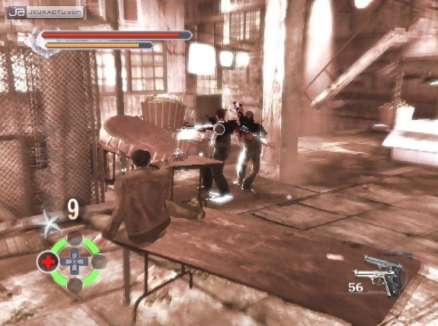 L’association Unreal Engine 3 et Havok permet à Stranglehold de présenter des décors totalement destructibles. De la simple caisse de fruits aux bâtiments et autres buildings, en passant par les véhicules, les portes, les chaises et autres éléments mineurs du décor, rien ne résistera aux balles qui fustigent de toute part. Il faut dire que pour faire honneur à la renommée du maître du gunfight, Stranglehold se devait de proposer des séquences de tirs digne de ce nom. Et Stranglehold n’a pas usurpé sa réputation. Le John Woo-fan aura de quoi émoustiller sa libido de gunfighter en herbe puisque tous les mouvements possibles et inimaginables ont été intégrés dans le jeu. C’est simple, pour pouvoir survivre à l’assaut de hordes d’ennemis toujours plus nombreux, Tequila est capable de glisser sur les tables, courir le long d’une rampe, prendre appui sur un mur, faire des plongeons de tous les côtés, s’agripper à des objets suspendus ou bien encore se cacher derrière un élément du décor. Bref, tant qu’à buter du monde, autant le faire avec classe. A cette panoplie de mouvements spectaculaires s’ajoutent le fameux ralenti dont est friand le cinéaste chinois. Il existe deux types de ralenti, celui qu’on peut utiliser en abondance en appuyant simplement sur la touche L2, soit en plongeant l’action dans un mode slow motion qui permet même de voir les balles se déplacer au ralenti, façon The Matrix et ainsi les éviter à la dernière minute. Grisant. Quant au combat au corps à corps, il s’agit d’une simple formalité puisque Tequila est juste capable d’assommer ses ennemis.
