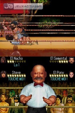 Bien au contraire, il repousse les frontières de la misère ludique. Construit autour d'une improbable alternance de combats de catch injouables et répétitifs et de mini-jeux grotesques, Super Nacho est une blague aussi grasse que son héros. Essayant, sans succès, de masquer sa réalisation minable derrière une esthétique décalée largement inspirée des créations flash qui circulent sur le net, le chef d’œuvre de Budcat peine même à exploiter convenablement les options tactiles de la DS. Si le problème est partiellement contourné dans des phases de fight qui ne font appel qu’aux boutons de la console, les petites activités débiles proposées en complément tentent toutes d’apprivoiser le stylet, et ce pour un résultat systématiquement catastrophique. Plagiant avec allégresse des titres dans la lignée de WarioWare, ces séquences vous invitent notamment à éviter, au volant d’un triporteur motorisé, des vaches en folie ; à écraser des abeilles avant qu’elles ne piquent Esqueleto, le famélique compère ; ou à lancer des melons sur le personnage principal. Se voulant amusants, ces intermèdes s’avèrent parfaitement insupportables tant la maniabilité est mal fichue. Les mouvements à exécuter nécessitent une précision surhumaine, les actions s’enchaînent mal et les différentes interfaces associées sont déplorables. Il vous faudra pourtant triompher de chaque épreuve pour développer les aptitudes physiques du loser ambitieux qu’est Nacho, et ainsi lui permettre de se ruer dans l’arène pour des combats moches et mous. Les coups, rigolos tendance cartoon, avec désarticulation de l’adversaire et autres têtes qui gonflent puis éclatent, sont difficiles à sortir, le personnage est odieusement peu réactif et l’attribution des boutons démontre que le terme "ergonomique" ne figure pas au vocabulaire de tout un chacun. Crispé par des musiques horripilantes, l’acheteur inconscient terminera ce bref calvaire ludique dans un état de tension confinant à la folie furieuse et, dans un dernier sursaut de lucidité, cravatera la honteuse cartouche avant de l’achever d’un beau german souplex des familles.