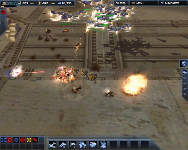 Manifestement désireux de convaincre ceux qui trouvaient Supreme Commander trop gourmand et trop difficile, Chris Taylor a quelque peu revu à la baisse les ambitions de son jeu de stratégie fétiche. Les cartes sont moins grandes que par le passé, les différents bâtiments moins nombreux, les outils de gestion stratégique un peu moins fins et le système de ressources a été quelque peu remanié. Tout cela pourrait nous faire craindre le pire, mais la nouvelle recette fonctionne en réalité très bien. Si les acharnés du premier épisode risquent tout de même de regretter certains changements, la majorité des joueurs saura se satisfaire de cette évolution. En premier lieu on ne peut qu'apprécier la performance technique, qui relègue aux oubliettes les problèmes de fluidité du premier volet. En effet, contrairement à son prédécesseur, le petit nouveau ne souffre d'aucun ralentissement majeur. Certains calculs de balistique ont-ils été simplifiés ? Si c'est le cas, il s'agit alors d'un compromis bienvenu. De toutes manières, ce qui fait l'essence même du jeu a été respecté : il est toujours permis de dézoomer à l'extrême, jusqu'à ce que tous les bâtiments et unités, amis comme ennemis, ne représentent plus qu'un point à l'écran. Lvéhicules se voient alors remplacés par de simples symboles, que l'on peut sélectionner et diriger tout naturellement. Certes, on a parfois du mal à identifier les différents types d'unités représentés, mais donner des ordres à un groupe devient extrêmement intuitif. Il suffit de placer la caméra à la hauteur qui nous sied le mieux, de sélectionner les engins, de dézoomer au maximum, puis de cliquer sur la destination de notre choix, éventuellement en zoomant à nouveau pour être plus précis. Les laborieux déplacements d'écran n'ont pas lieu d'être et l'affichage de la mini-map devient totalement facultatif. Et même si les cartes sont moins étendues qu'auparavant, Supreme Commander 2 reste un jeu de stratégie à grande échelle, qui nous fait manipuler des unités par centaines plutôt que par dizaines et qui ne se contente pas d'une seule usine de chaque type. Pour accélérer la production d'unités, il ne faut pas hésiter à construire chaque bâtiment en double, triple, voire même en quintuple exemplaire.