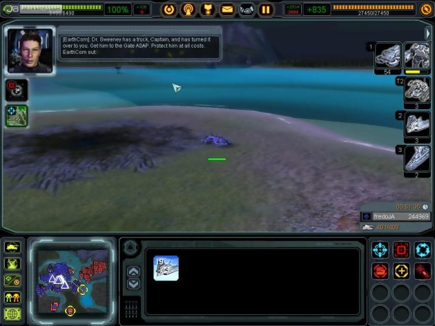 Pour comprendre toutes les subtilités du titre, passons logiquement par la case didacticielle On évolue sur une carte entièrement libre et dénuée de tout ennemi pour se familiariser avec les différentes commandes de base. A tout moment, on peut accéder à une dizaine de vidéos pour comprendre le fonctionnement d’un point bien particulier. Les trois campagnes sont par contre bien plus formatrices et offrent un apprentissage progressif. Ainsi, la première mission passe en revue la gestion des ressources, la création de bâtiments, la gestion des radars et de son armée. Il n’y aucune différence de niveau entre ces missions, mais l’on peut y progresser à sa guise. Chaque mission dure au moins deux bonnes heures, autant dire que la durée de vie est conséquente. L’intérêt est sans cesse renouvelé par des missions variées : espionnage, défense d’une base, escorte d’un convoi, triangulation d’une zone de la carte avec des radars pour détecter l’ennemi, etc. Les objectifs sont donnés au compte-goutte et la progression est assez atypique. En effet, là où on a l’habitude de passer au niveau suivant à partir d’un certain stade de la partie, la carte s’agrandit jusqu’à doubler de volume, et de nouvelles tâches nous sont confiées. On évite ainsi toute la partie construction de base un peu barbante et surtout la frustration que connaissent beaucoup de joueurs d’avoir établi un camp avec des infrastructures et une armée digne de ce nom pour du vent. Cela n’empêche pas d’avoir toute sa stratégie à repenser au fur et à mesure de l’agrandissement de la carte. L’ennemi peut par exemple se trouver sur le front Est alors que toutes nos infrastructures militaires se trouvent au Sud. De nouvelles sources d’énergies apparaissent et il faut rapidement prendre le contrôle des positions stratégiques (îlots, etc.) pour construire des avant-postes. Souvent, l’arbre des technologies s’agrandit et déverrouille tout un tas de bâtiments et d’unités encore plus performantes. Les différentes cartes prennent finalement une envergure monstrueuse et ses dimensions atteignent parfois les 80 kilomètres de largeur et de longueur. Du jamais vu !