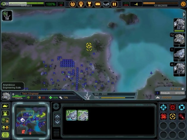 Tous ces moyens ne seraient pas mis en œuvre si l’on ne pouvait pas contrôler de gigantesques armées. Par défaut, la limite est fixée à 500 unités, mais cela n’empêche pas de voir s’affronter jusqu’à plusieurs milliers d’unités sur un champ de bataille. Dans Supreme Commander, la guerre est totale et massive. On se bat sur tous les fronts et il faut bien veiller à équilibrer ses forces sur terre, mer et air. Un bâtiment spécifique est dédié à chaque corps d’armée et peut évoluer au cours du temps sur 3 niveaux. Certaines unités dites « expérimentales » sont également de la partie. Chaque amélioration technologique permet logiquement de produire des unités à la puissance sans cesse augmentée. Ainsi, une unité de niveau 3 ne fera qu’une bouchée d’une bonne dizaine d’unités de niveau 2. On a donc tout intérêt à évoluer le plus rapidement possible si notre économie le permet. Toutefois, il ne s’agit pas uniquement d’améliorations existantes et les usines de niveau 3 peuvent tout aussi bien produire des unités de niveau 1, 2 et 3. Par exemple, certains tanks de niveau sont spécialisés dans la défense aérienne et on retrouve aussi un générateur de bouclier mobile de niveau 2, indispensable pour limiter les dommages subis durant une attaque. Les différentes unités sont réellement variées. On retrouve ainsi croiseur, destroyer, sous-marin, marine, tank, artillerie mobile, intercepteur aérien, bombardier, tank amphibie, etc. On ne les compte plus. Bien souvent, il faudra souvent composer son armée avec un maximum d’unités complémentaires, le système étant en effet un peu calqué sur le principe de pierre-papier-ciseaux, supprimant ainsi tout hasard. La topographie des environnements n’est pas prise en compte, mais on ne boude pas son plaisir pour autant. Supreme Commander est clairement orienté vers la stratégie « pure » et toutes les phases de micro-gestion sont automatisées au maximum. Les ingénieurs sont par exemple très doués et ont la capacité de construire, réparer et même capturer un bâtiment. On peut les programmer pour leur affecter tout un tas de tâches successives et il en est de même avec les structures militaires. Ainsi, on peut par exemple les upgrader au stade 2, puis au stade 3, recruter une quarantaine de tanks, puis faire de même avec des marines. On peut même leur affecter des directives bien avant leur création, c'est-à-dire assurer un pont aérien entre ses usines de production et une zone militaire de son choix par exemple. On peut donc rapidement délaisser toutes ces formalités administratives sans être tracassé, qu'elles produisent quelque chose ou non.