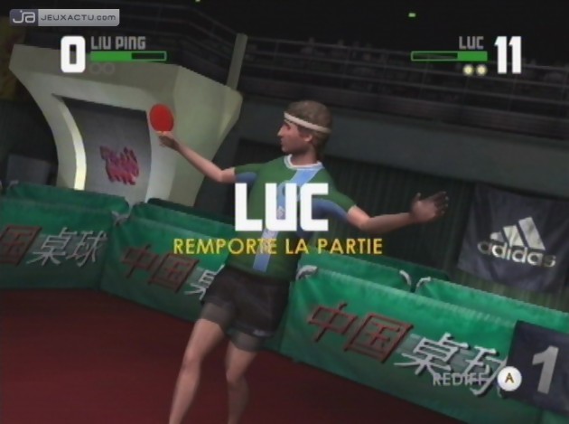 Mais avant de maîtriser Table Tennis, il va falloir cravacher sec, se donner à fond. Malgré l’absence d’un mode "Carrière", Table Tennis arrive néanmoins à tenir la dragée haute en mode multijoueur. Pourquoi ? Tout simplement parce qu’il va falloir se lever tôt pour débloquer l’ensemble des bonus du jeu. Personnages, maillots, tournois et décors, chacun de ses éléments deviennent accessibles à la fin d’un match victorieux, lancés dans le mode Tournoi, composé de trois championnats : Bronze, Argent et Or. Car lorsque vous lancerez Table Tennis, vous n’aurez accès qu’à 4 pongistes, pas les plus mauvais (Liu Ping étant le joueur le plus complet) rassurez-vous, mais après quelques heures de jeu, on n’aura vite fait de vouloir les autres sportifs. Mark, Juergen ou bien encore Jung-Soo font partie des pongistes les plus appréciés grâce à leurs capacités à tromper l'adversaire grâce à leurs effets. A l’instar d’un jeu de tennis, le choix de son pongiste se fait bien évidemment en fonction de ses préférences. Pour commencer, il convient de choisir Liu Ping, certainement le perso le plus équilibré et le plus complet. Chinois d’origine, il tient sa raquette façon porte-plume comme on dit dans le jargon du ping-pong et s’avère être un excellent compromis pour bien débuter. Si on se découvre une passion soudaine pour la brutalité, mieux vaut se tourner vers un Jesper (son coup droit est tout bonnement dévastateur) ou un Mark, deux brutes épaisses qui aiment jouer les bourrins de service. En revanche, ceux qui ont tendance à se la jouer fourbe avec des coups plus vicieux et mise avant tout sur la stratégie, Juergen, Jung-Soo ou bien encore Kumi vont très bien l’affaire. Mention spéciale à Luc, le seul Français du jeu, reconnaissable entre mille avec son look inimitable. On s’en souviendra.