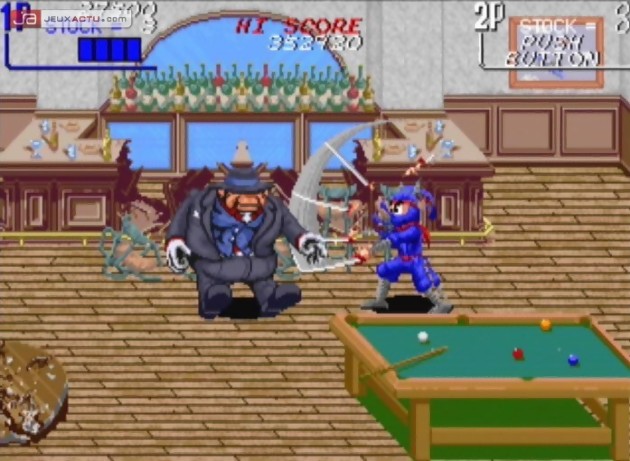 La nausée ne disparaîtra pas grâce à Jungle Hunt (1982) où un Indiana Jones en herbe saute de liane en liane, nage entre les crocodiles, pour sauver le plat du jour des cannibales : sa fiancée. C’est laid, injouable et ennuyeux. On zappe. Plus réjouissant, The New Zealand Story (1988) est une autre pièce maîtresse de la compilation. Enfin un jeu doté d’une âme et d’une véritable identité ! Ce petit jeu de plates-formes dans lequel un kiwi doit libérer ses congénères capturés par un méchant morse (recherche scénariste motivé) doit traverser l’archipel néo-zélandais à la sueur de ses petites ailes. Il ne sait pas encore voler, mais peut emprunter des appareils volants à cet effet. C’est mignon, coloré, fruité et old school comme on l’aime. Ninja Kids (1990) est peut-être un des jeux les plus funs de la compilation. Ce beat’em all bourrin sorti en 1990, âge d’or s’il en est, se situe après Double Dragon et avant Streets of Rage, mais possède déjà un gameplay au poil. Bien que légèrement bourrin et limité, il comporte tous les mouvements du cahier des charges de l’époque. Jump, dash, magies, enchaînement, roulades… Dommage que son design soit un des plus laids jamais imaginés. Quant à Operation Wolf (1987) et Operation Thunderbolt (1988) nous sommes contraints de passer rapidement dessus. Ces jeux de tirs sont pourtant de grands classiques, mais voyez-vous, un gun shooting sans gun…