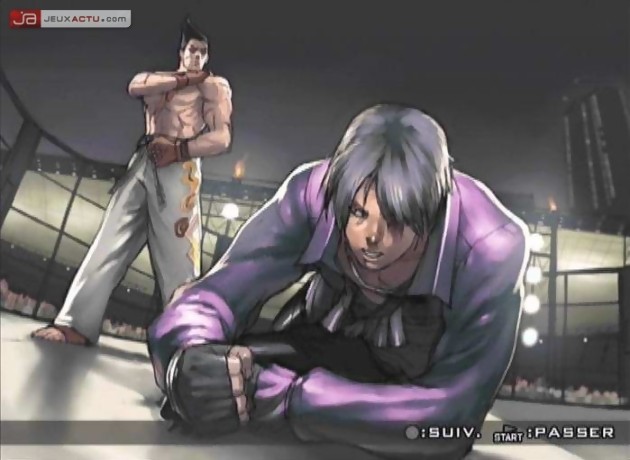 Bien sûr, on aurait aimé voir davantage de personnages inédits mais la présence d’anciennes figures de la série, disparues depuis Tekken 2, suffit amplement pour nous réjouir. Comme tout Tekken qui se respecte, une bonne partie des personnages ne seront accessibles qu'une fois après les avoir débloqués en terminant le jeu dans le mode "Histoire". Onze individus se cachent derrière un point d'interrogation et n'attendent plus que vous pour se dévoiler au grand jour. Inutile de faire monter la sauce plus longtemps, l'ensemble de ces persos cachés ont d'ores et déjà été révélés par Namco, lors de diffusion de screenshots et artworks sur le web. Seuls trois personnages font véritablement leur entrée pour la première fois au sein de cette grande famille. Pour trois ans d'attente, c'est peu, je vous l'accorde, d'autant que les anciennes figures n'ont guère évolué en matière de coups ou de combos. Parmi les quelques personnages exclusifs à ce Tekken 5, on retiendra le nom de Raven. Mystique dès l’intro du jeu, il dégage une classe certaine et sa technique de combat le classe parmi les persos les plus dévastateurs, pour peu qu’on apprenne à le maîtriser. Sa couleur de peau tend à le trahir mais Raven est bel et bien un ninja des temps modernes. Ses costumes alternatifs lui rendent d'ailleurs honneur. Feng Wei impose également son style dès la cinématique et s'avère être un personnage d'une force impressionnante. Recherché par les forces de Police et notamment par Lei, Feng Wei n'est pas du genre bavard et préfère faire parler les mains avant de sortir quelques phrases assassines en Mandarin. La classe quoi. Pour le dernier personnage inédit, Namco a opté pour Asuka, une jeune fille quelque peu turbulente et pas franchement convaincante dans son style de combat.