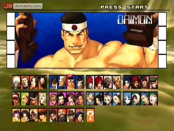 The KOF 2000/2001 est donc bien là, sur PS2. Une fois le DVD inséré dans le tiroir de la console, une première chose nous permet d’esquisser un sourire. Le jeu nous donne la possibilité de choisir entre le mode 50 ou 60 Hz à l’instar de Metal Slug 3. La sélection du jeu se fait ensuite sur la page suivante. KOF 2000 étant le dernier volet développé par SNK himself, c’est avec une certaine nostalgie que nous nous décidons à lancer le jeu. Si on fait exception des musiques remixées, KOF 2000 est à peu de choses près identique à la mouture Neo Geo. Les 35 personnages bien présents sont répartis en 8 équipes de quatre. Les trois derniers persos étant Kyo, Iori et Kula et font chacun bande à part. Depuis KOF '99, les équipes ne sont donc plus composées de trois mais de quatre combattants, le dernier sélectionné faisant office de Striker.
