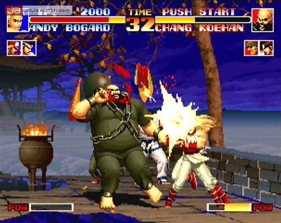 En évoquant le charme du titre, on ne peut s’empêcher de penser aux furies qui, à l’époque, donnaient un véritable sens au terme. Si chaque perso ne disposait que d’une seule attaque de dernier recours, cette dernière avait au moins le mérite de faire son petit effet. Un tiers de la barre de vie était effectivement retiré si on se la prenait de plein fouet. Gare aux imprudents donc qui pensent toujours qu’il est possible de se manger trois ou quatre furies en estimant qu’il restera suffisamment de souffle pour rester debout. Que nenni, KOF ’94 ne fait pas dans la dentelle et c’est la même tambouille une fois que vous aurez gonflé votre jauge de pouvoir. Une fois complète, votre bonhomme se met alors à clignoter pendant un certain temps (assez longtemps tout de même). En sus d’autoriser l’exécution de la furie (qui se déclenche aussi dès que le seul critique de barre de vie est atteint), votre force de frappe augmentera subitement de 20% et le moindre coup porté avec un strong punch ou strong kick laisse des traces qui oblige à réfléchir avant de foncer tête baissée. Cette sensation de puissance est fortement appuyée par le son émis à l’impact des coups. Retrouvez ce panache est un réel plaisir et on ne peut que s’apitoyer sur le fait de ne pas retrouver cette puissance dans les KOF dernières générations, KOF 2003 en tête de citation.
