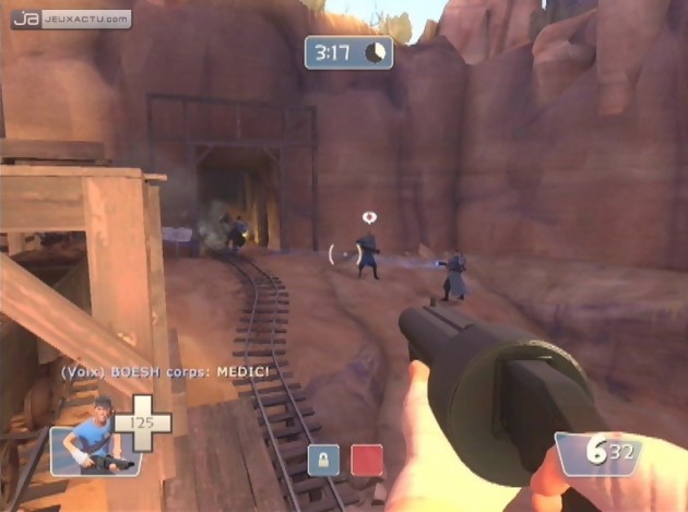 Alors derrière Team Fortress 2 se cache en réalité une longue histoire, une très longue histoire. Il faut en effet savoir qu'il a été annoncé à l'origine en 1999 et affichait un style graphique très sérieux, très premier degré. Finalement, huit ans plus tard, le bébé sort enfin et n'a plus grand chose à voir avec le projet de départ ! Un simple coup d'oeil sur les screenshots, et vous verrez qu'il a adopté un style très cartoon et donc une ambiance nettement moins austère. Pour résumer, vous jouez en équipe (jusqu'à huit joueurs) sur des maps proposant soit de la capture de drapeau, en l'occurrence une mallette, soit de la capture de zones ou de points de contrôle. L'intérêt ne réside pas tant dans le principe, assez basique, mais dans le fait que vous avez le choix parmi neuf classes de personnage, comme dans le premier Team Fortress d'ailleurs. Vous pourrez par exemple incarner un éclaireur, rapide et capable de faire un double saut, idéal pour aller vite attraper une malette par exemple, mais qui ne fera pas long feu en combat. Il y a un mitrailleur, un sniper, un médecin (tous les joueurs peuvent l'appeler en cliquant sur le stick droit, à lui de vite les retrouver pour leur administrer des soins), un espion (qui peut devenir invisible momentanément et mieux, se déguiser en n'importe quel personnage ennemi !), un ingénieur (qui peut poser des tourelles, entre autres), un soldat équipé d'un lance-roquette... Du coup, pour mettre un maximum de chances de leur côté, les joueurs d'une même équipe ont tout intérêt à se consulter pour répartir les rôles et optimiser leurs capacités.