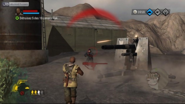 Tommy Mac est une sorte de Rambo, montagne de muscles au cœur d’artichaut. S’il avait une devise, ce serait : droit devant. Il dispose d’une mitraillette, mais on devine rapidement que le lance-flamme fait de lui un pyromane chronique qui allume tout ce qu’il croise. Même les femmes. Sa condition physique est olympique. Catégorie poids-lourds. Lunettes de soleil sur le nez, cigare aux lèvres, Deuce Williams a tout du cow-boy, même le pistolet. Sauf que son cheval est un char d’assaut. C’est le plus haut gradé de l’équipe, mais qui s’en soucie vraiment ? Même quand il n’est pas sur son char d’assaut, il ne peut s’empêcher d’utiliser du très gros calibre. C’est donc le bazooka qui aura sa préférence. Peut-être pour combler un complexe de taille ? Nous ne le saurons jamais. L’éclaireur JD Tyler, qui représente les minorités, est quant à lui à l’aise en toutes circonstances. De loin grâce à son fusil, en combat rapproché grâce à son fusil à pompe, ou encore carrément au contact où son couteau fait merveille. Coup de chance, sa vitesse et son endurance constituent un atout majeur pour passer d’une situation à une autre. Bien que guidés par l’état major, ces trois-là font la guerre à leur manière. Le joueur incarne l’un des trois personnages au choix, mais il peut en changer à chaque point de restauration après une mort. Les commandes se maîtrisent assez bien. RT pour tirer en toute logique, LT pour lancer une grenade en toute logique également, RB pour courir. Croyez moi, quand une mitrailleuse vous plombe les fesses, on trouve rapidement le bon bouton. Quant à la touche LB, elle permet de changer d’arme. Comme dans tout bon jeu Xbox, 360 ou pas, l’utilisation des 2 sticks (déplacement et regard) devient rapidement une seconde nature dont on peine à se passer sur les autres consoles. Cependant, est-ce l’adrénaline ou mes gros doigts (ou les deux ?) toujours est-il que l’utilisation de click gauche pour s’accroupir et du click droit pour viser ne constituent pas la caractéristique la plus fluide et la mieux maîtrisé de mon jeu.