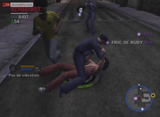 Mais The Warriors ne s’arrête pas seulement à ces quelques broutilles. Bien évidemment, il s’agit d’un beat’em all avant tout et les combats ont par la part belle dans le jeu mais Rockstar Toronto n’a justement pas souhaité dans le cliché du "j’avance-je frappe-j’avance-je frappe-je m’ennuie-je frappe". D’autres actions parallèles ont été adjointes pour donner un peu plus de profondeur à un genre finalement assez obtus dans le fond. The Warriors prend en effet en compte la notion d’argent et tout ce qui l'englobe. En bon voyou que nous sommes, il va falloir dévaliser des boutiques pour se faire un peu de blé pour se payer sa dose de flash, la trousse de soins de circonstance, mais aussi ses bombes de peinture pour s’exprimer sur les murs de New York. Le jeu est ainsi ponctué de mini-interactions insérées ici et là pour renforcer l’immersion, déjà bien présente du jeu. Il sera possible également de dévisser des autoradios dans des voitures, après avoir soigneusement éclaté la vitre. Dans ce cas précis, il faudra alors jouer avec le stick analogique pour réussir parfaitement la manœuvre. Si l’envie vous prenait de fracasser une porte de votre pied droit, pas de souci, l’interaction avec le décor le permet également. Parfois, il conviendra de déverrouiller une porte en crochetant le verrou pour ne pas donner l’alerte à la police du coin. De cette manière, il est possible d’entrer à l’intérieur des magasins pour récupérer des armes ou du cash pour ensuite se payer un petit flash et se refaire une santé de fer. Rarement seul, souvent accompagné, les autres membres du gang répondent au doigt et à l’œil grâce au système de commandes proposé par le jeu. "Massacrez-les tous", "Protégez mes arrières", "Stop", "Allons-y", les six actions disponibles permettent de s’en sortir la plupart du temps, d’autant plus que le comportement des autres Warriors est plutôt bien géré par l’ordinateur. Attention tout de même à ne pas les confondre avec un autre voyou dans la confusion d’un combat, car ces derniers ne sont pas insensibles à vos coups et peuvent très bien succomber aux blessures. Mais là encore, Rockstar a pensé à tout puisqu’il est possible, le cas échéant, de les remettre d’aplomb en leur attribuant un petit flash. Exaltant.