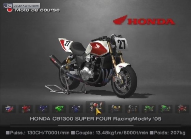 Enchaînons nos péripéties désormais avec le mode "Tourist Trophy". Là non plus, pas de surprise, on reste en terrain connu. "Permis", "Garage", "Courses" et mode "Photo" – qui permet notamment de sauvegarder sur votre clé USB des clichés des courses et de les imprimer – ou encore constructeurs. Les licences passent toutefois au nombre de quatre et semblent un petit peu moins élitistes qu'auparavant même si les novices souffriront certainement quelques heures sur les dernières épreuves. Bien sûr, pour faciliter l'apprentissage de ces derniers, on retrouve évidemment les fameux marqueurs au sol. Petit désagrément : le passage à l'étape supérieure ne se fait pas automatiquement après remporté une étape et il faut donc passer par le menu principal. Rien de bien méchant toutefois. Quant au reste, la petite subtilité est que toute notion d'argent a disparu. Plus besoin de s'acharner sur une bourrique sur les mêmes championnats pour pouvoir s'offrir le bolide de ses rêves ou ne serait-ce que l'équiper. L'équiper ? Ah non, ce n'est plus possible ici d'ailleurs et les réglages avant la course sont vraiment minimalistes. Voilà tout un pan entier du système de jeu de Gran Turismo 4 qui est amputé ici alors qu'il s'agissait d'une des plus grandes richesses du titre. Alors comment débloquer les fameuses motos ? Par le mérite tout simplement. Sur le papier, cela semble bien beau mais dans concrètement, cela se passe comment ? Comme on pouvait s'y attendre également, on démarre un peu sur des chapeaux de roues avec un simple scooter dont ne voudrait probablement pas un livreur de pizza. Les 10 plus prestigieux constructeurs (Yamaha, Honda, Kawasaki, Suzuki, Aprilia, BMW, etc.) se sont alors donnés rendez-vous pour présenter une sélection de leur catalogue, soit entre 2 et une vingtaine de véhicule de course pour chacun (ce qui nous fait 125 motos à débloquer au total). Ainsi, si une moto attire votre attention, vous pourrez alors la gagner en remportant un défi. Il va sans dire bien sûr qu'il y autant de challenges que de motos en jeu mais on regrettera que ces derniers manquent un peu de variété. En effet, il s'agit principalement de dépasser et de tenir tête à son adversaire durant une dizaine de secondes ou de remporter la course.