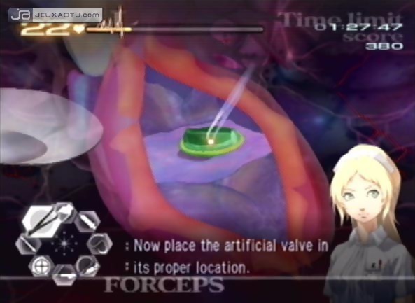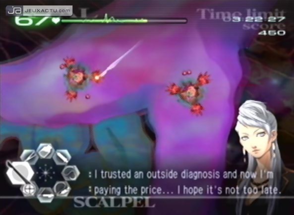 Que le joueur puisse se rassurer, Trauma Center : Second Opinion n’est pas qu’une pâle copie, mais bien un remake de qualité. En effet, on remarque ici de probantes améliorations ergonomiques, et l’interactivité a été très fortement optimisée. Ce qui était très aisé avec le stylet aurait vite fait de devenir un cauchemar, si nous devions à chaque fois gesticuler à toute vitesse notre Wiimote pour prendre l’outil voulu et revenir sur la zone précise à traiter. La disposition des instruments a ainsi été modifiée : ceux-ci ne sont plus placés de part et d’autre de l’écran, mais forment un petit anneau dans le coin inférieur gauche de l’écran, ce qui permet de ne plus encombrer le visuel principal et de se concentrer sur le patient. De même façon, Le positionnement de ces instruments permet un repérage instinctif avec le Nunchuk. Plus besoin donc de transpirer en faisant des allers-retours constants pour changer d’instrument, une simple inclinaison du stick analogique avec le pouce suffit, ce qui permet un gain de temps considérable. Pour ne citer quelques étapes de l’extraction d’une tumeur, en une fraction de seconde vous passez du scalpel (droite) à la pince (en haut à gauche), puis au gel désinfectant (haut). Les capacités de la Wiimote sont ici optimisées, notamment avec l’utilisation de la pince où la gestuelle est réellement mimée avec la pression simultanée de la touche A et B pour attraper la partie voulue. On saluera au passage la simplification de la fonction "magnifier" : une simple pression du bouton A vous permettra de zoomer et dézoomer.