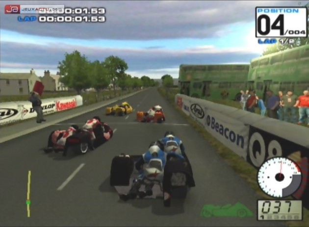 Si on ne peut que saluer une telle exhaustivité à ce niveau, le résultat reste finalement mitigé car les différences lors du passage d’une catégorie à une autre sont minimes. TT Superbikes essaie donc de nous en mettre plein la vue avec certains détails – comme la gestion des freins avant et arrière avec le stick gauche ou encore le fait de voir le pilote mettre le gaz et décélérer – mais dérape complètement à cause d’un gameplay totalement bancal. Ainsi, doubler un concurrent ou même négocie correctement un virage devient vite un véritable tour de force et ce n’est pas l’interface peu ergonomique qui vient arranger les choses. En effet, les différents angles de vue n’offrent pas assez de lisibilité et la carte du tracé manque sérieusement de précision pour pouvoir l’utiliser de manière efficace. Et non content d’avoir du mal à se repérer, chaque faute de conduite est sévèrement sanctionnée par une sortie de piste totalement fantaisiste qui va jusqu’à projeter votre pilote sur une dizaine de mètres rien que pour un simple accrochage. En sus, le laps de temps nécessaire pour se replacer sur la piste est excessivement long et limite par là même sérieusement le droit à l’erreur. Enfin, on aurait pu bien trouver un prétexte pour pardonner cet éloge de la médiocrité si la réalisation du titre lui permettait de relever la tête. Malheureusement, on est très loin du compte et il faut accepter l’évidence qu’en plus d’être peu jouable, TT Superbikes est laid. Avec près de 60 kilomètres de parcours, la modélisation de la Tourist Trophy de l’île de Man aurait pu nous faire voir du paysage. Cependant, les développeurs ont préféré n’en conserver qu’une faible partie dans un style graphique le plus dépouillé possible et avec une dominante pour les lignes droites, ce qui, bien entendu, rend les parties terriblement monotones. Bref, acheter ce jeu au prix coûtant n’est certainement pas une bonne affaire.