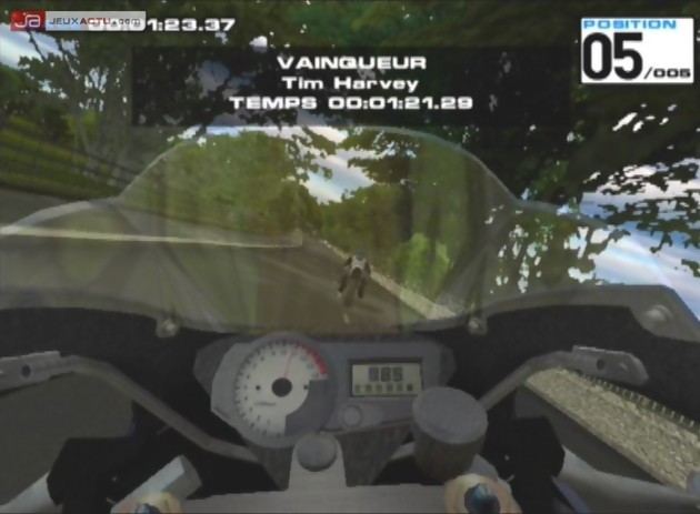 Si on ne peut que saluer une telle exhaustivité à ce niveau, le résultat reste finalement mitigé car les différences lors du passage d’une catégorie à une autre sont minimes. TT Superbikes essaie donc de nous en mettre plein la vue avec certains détails – comme la gestion des freins avant et arrière avec le stick gauche ou encore le fait de voir le pilote mettre le gaz et décélérer – mais dérape complètement à cause d’un gameplay totalement bancal. Ainsi, doubler un concurrent ou même négocie correctement un virage devient vite un véritable tour de force et ce n’est pas l’interface peu ergonomique qui vient arranger les choses. En effet, les différents angles de vue n’offrent pas assez de lisibilité et la carte du tracé manque sérieusement de précision pour pouvoir l’utiliser de manière efficace. Et non content d’avoir du mal à se repérer, chaque faute de conduite est sévèrement sanctionnée par une sortie de piste totalement fantaisiste qui va jusqu’à projeter votre pilote sur une dizaine de mètres rien que pour un simple accrochage. En sus, le laps de temps nécessaire pour se replacer sur la piste est excessivement long et limite par là même sérieusement le droit à l’erreur. Enfin, on aurait pu bien trouver un prétexte pour pardonner cet éloge de la médiocrité si la réalisation du titre lui permettait de relever la tête. Malheureusement, on est très loin du compte et il faut accepter l’évidence qu’en plus d’être peu jouable, TT Superbikes est laid. Avec près de 60 kilomètres de parcours, la modélisation de la Tourist Trophy de l’île de Man aurait pu nous faire voir du paysage. Cependant, les développeurs ont préféré n’en conserver qu’une faible partie dans un style graphique le plus dépouillé possible et avec une dominante pour les lignes droites, ce qui, bien entendu, rend les parties terriblement monotones. Bref, acheter ce jeu au prix coûtant n’est certainement pas une bonne affaire.