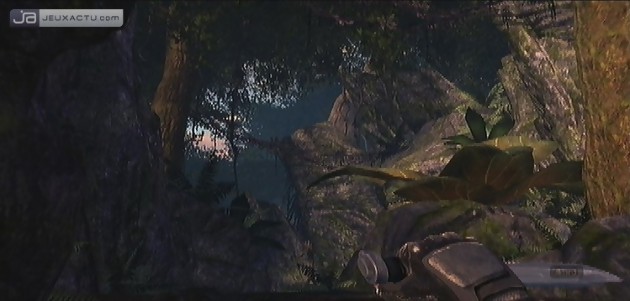 Difficile de prédire quel rôle vous allez tenir dans Turok. Tantôt vous deviendrez le quatre-heures d’un dino aux dents longues, tantôt vous serez pris en grippe par un soldat lourdement armé avant que celui-ci ne se fasse dévorer tout cru par un raptor affamé. Là est peut-être tout l’intérêt du jeu, à savoir se faire des alliés au moment le plus opportun. D’ailleurs, comme le dis le vieil adage : "l’ennemi de mon ennemi est mon ami". Il ne faut pas perdre de vue qu’il est possible d’exterminer les ennemis de plusieurs façons. Ceux qui préfèreront faire parler la poudre auront recours aux nombreuses armes à feu du jeu qu’il s’agisse de mitraillettes, de shotguns, de fusil de sniper, de grenades, de lance-missiles ou de canon plasma. De ce point de vue-là, ils seront servis avec, pour chacune des armes, deux modes de tirs différents. Au contraire, les joueurs voulant se faire discret préfèreront utiliser l’arc ORO C9 Perforator. Plus vous le bandez, plus votre flèche touchera une cible éloignée, le tout dans un silence de mort. Pratique pour ne pas vous faire repérer. Pour le combat rapproché, rien n’est plus mortel que votre poignard de combat. Si de prime abord, cette arme semble ridicule face aux sbires de Kane et aux dinosaures, elle est incontestablement l’arme la plus mortelle du jeu. Tapis dans les fougères de la jungle, vous pouvez asséner une technique de close combat en vous rapprochant suffisamment de votre ennemi. Lorsque la lame de votre couteau pointe vers le haut, il est temps de faire couler le sang au travers d’une cut-scene d’une rare violence. Cependant, lorsque vous vous attaquerez aux dinosaures, le timing sera primordial pour saigner votre proie. Ces derniers n’hésiteront pas à battre en retraire, vous sautez sur le coin du museau ou grimper aux arbres pour éviter de finir en tournedos. Aussi étrange que cela puisse paraître, les dinos de Turok sont beaucoup intelligents que les rebelles que vous poursuivez. Les humains se contentent bêtement de se planquer derrière une caisse, peu importe s’ils sont à couvert ou pas, de recharger leurs armes devant vous ou pire encore de fixer une grenade qui tombe à leurs pieds. Indéniablement, on préfèrera les joutes avec les sauriens réservant leur lot de surprises. Les créatures utilisent ingénieusement la végétation pour s’y planquer avant de bondir sur votre carotide. S’enchaîne alors un QTE différent selon l’attaque, Quick Time Event dans lequel vous devrez marteler les gâchettes ou le stick analogique pour vous défaire d’une mort assurée. Seul problème, c’est qu’un fil des heures le schéma de jeu ne change guère. Ainsi donc on pourrait résumer Turok en trois étapes : combat contre les dinosaures, affrontement avec les mercenaires et pot-pourri de tout ce beau monde. Ajoutons à cela quelques scripts ici ou là et une linéarité omniprésente camouflée par de vastes paysages.