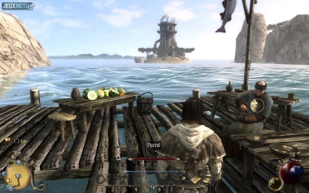 Si l'examen du jeu s'arrêtait là, on pourrait presque croire à un hit. Hélas, ses défauts sont également nombreux, et surtout prégnants. Le premier d'entre eux est sans conteste possible l'indigence du doublage français. Tous les personnages s'expriment d'un ton monocorde absolument pas convaincant. On oscille donc entre l'ennui et l'énervement face à un tel amateurisme. Cela concerne également le héros qui, de plus, se fend régulièrement de répliques plates, nazes et répétitives. Il faut l'entendre pour le croire ! Et n'espérez pas vous rabattre sur les sous-titres, ils donnent également dans la médiocrité orthographique et grammaticale la plus crasse ("guardien", "en êtes tu bien sûr ?", "diminue rla pression"...). On retrouve également à plusieurs reprises des termes anglo-saxons non traduits. Le jeu à proprement parler souffre par ailleurs de ses propres lacunes, parmi lesquelles figure une intelligence artificielle ennemie très modeste. Placez-vous derrière un arbre ou un rocher et vous verrez souvent les archers et les mages jeter à l'infini leurs projectiles contre l'obstacle. On peste également contre l'interface qui abuse des commandes multifonctions. La même touche est ainsi assignée au saut, à la montée à cheval, à l'ouverture des coffres et au lancement des conversations. De même, le bouton droit de la souris sert à la fois à la parade, au déplacement furtif et à la course. Oui, vous avez bien lu, le même bouton actionne la marche lente et la marche rapide, selon le moment où on le presse. On s'emmêle donc immanquablement les pinceaux, et il faut vraiment du temps avant de ne plus commettre d'erreur. Une autre mauvaise surprise attend les aventuriers : la dernière des quatre îles qui composent le monde manque clairement de contenu et se visite un peu trop rapidement, alors qu'il s'agit paradoxalement de celle présentant la plus grande surface. Reste tout de même à porter au crédit du jeu une vraie spécificité : la présence de cinq modes multijoueurs. Les compétiteurs s'affronteront en "Duel" ou "Match à mort". Les joueurs plus coopératifs opteront quant à eux pour le mode "Aventure" (sept quêtes à parcourir en équipe) ou la Chasse aux cristaux (deux équipes luttent pour ramasser un maximum de cristaux). Enfin, le mode Village se destine carrément aux stratèges et aux gestionnaires, puisqu'il consiste à bâtir et à diriger une bourgade que pourront visiter les autres joueurs. Une vraie originalité qu'on attendait d'autant moins que l'aventure solo reste toujours classique.