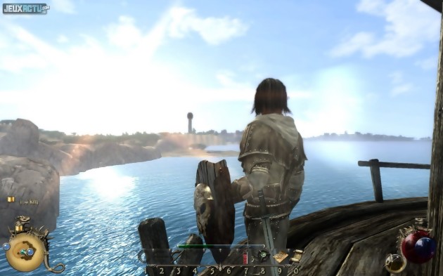 Si l'examen du jeu s'arrêtait là, on pourrait presque croire à un hit. Hélas, ses défauts sont également nombreux, et surtout prégnants. Le premier d'entre eux est sans conteste possible l'indigence du doublage français. Tous les personnages s'expriment d'un ton monocorde absolument pas convaincant. On oscille donc entre l'ennui et l'énervement face à un tel amateurisme. Cela concerne également le héros qui, de plus, se fend régulièrement de répliques plates, nazes et répétitives. Il faut l'entendre pour le croire ! Et n'espérez pas vous rabattre sur les sous-titres, ils donnent également dans la médiocrité orthographique et grammaticale la plus crasse ("guardien", "en êtes tu bien sûr ?", "diminue rla pression"...). On retrouve également à plusieurs reprises des termes anglo-saxons non traduits. Le jeu à proprement parler souffre par ailleurs de ses propres lacunes, parmi lesquelles figure une intelligence artificielle ennemie très modeste. Placez-vous derrière un arbre ou un rocher et vous verrez souvent les archers et les mages jeter à l'infini leurs projectiles contre l'obstacle. On peste également contre l'interface qui abuse des commandes multifonctions. La même touche est ainsi assignée au saut, à la montée à cheval, à l'ouverture des coffres et au lancement des conversations. De même, le bouton droit de la souris sert à la fois à la parade, au déplacement furtif et à la course. Oui, vous avez bien lu, le même bouton actionne la marche lente et la marche rapide, selon le moment où on le presse. On s'emmêle donc immanquablement les pinceaux, et il faut vraiment du temps avant de ne plus commettre d'erreur. Une autre mauvaise surprise attend les aventuriers : la dernière des quatre îles qui composent le monde manque clairement de contenu et se visite un peu trop rapidement, alors qu'il s'agit paradoxalement de celle présentant la plus grande surface. Reste tout de même à porter au crédit du jeu une vraie spécificité : la présence de cinq modes multijoueurs. Les compétiteurs s'affronteront en "Duel" ou "Match à mort". Les joueurs plus coopératifs opteront quant à eux pour le mode "Aventure" (sept quêtes à parcourir en équipe) ou la Chasse aux cristaux (deux équipes luttent pour ramasser un maximum de cristaux). Enfin, le mode Village se destine carrément aux stratèges et aux gestionnaires, puisqu'il consiste à bâtir et à diriger une bourgade que pourront visiter les autres joueurs. Une vraie originalité qu'on attendait d'autant moins que l'aventure solo reste toujours classique.
