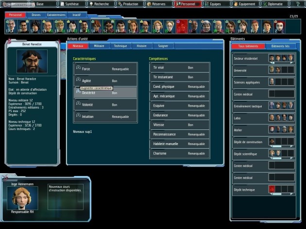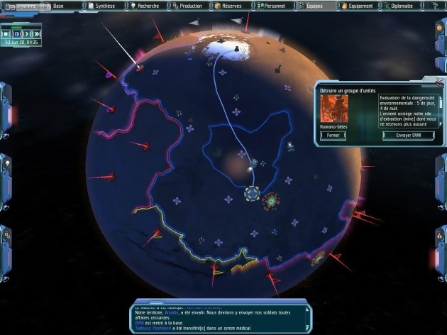 UFO : Afterlight est un jeu de conquête territoriale. Si l’argent n’est pas ici le nerf de la guerre, vous ne pourrez vous épanouir sur Mars sans disposer de ressources naturelles, sans produire d’armes et d’équipements divers, sans réaliser de percées scientifiques. Dirigeant d’une base peuplée de quelques laborieux pionniers, vous devez structurer au mieux votre petite communauté. Chacun de vos hommes dispose de compétences (pas forcément exclusives) militaires, scientifiques ou techniques, que vous pouvez développer en affectant ces joyeux larrons à des tâches diverses. Les techniciens gagnent de l’expérience en concevant des objets dans l’atelier ou en installant des sondes et des mines; les scientifiques apprennent en explorant des sites archéologiques, ou en procédant à des recherches dans le labo ; les soldats s’aguerrissent en affrontant les différentes créatures qui hantent le sol martien. Seules ces dernières missions bénéficient d’un gameplay spécifique. Pour le reste, tout est une question de bon sens managérial (oh le terme odieux !). Ainsi, tout le processus d’organisation territoriale se résume à une carte planétaire découpée en zones sur lesquelles vous pouvez lancer, d’un simple clic, la construction de quelques structures simples. Le gestion des ressources humaines (argh) constitue un volet un poil plus délicat, puisque si vous pouvez affecter n’importe quel groupe de recherche à un champ d’investigation précis, il est préférable que l’équipe soit composée de spécialistes du domaine, donc d’unités que vous aurez préalablement formées (en cliquant sur un bouton "formation" et en attendant quelques heures martiennes). Mais entre les hommes envoyés explorer les contrées voisines, les soldats-techniciens blessés au combat et bloqués en salle de soins et les unités en formation, vous manquerez souvent de monde pour faire tourner correctement cette folle machine que deviendra rapidement votre base.