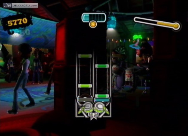 Pour ce faire, rien de tel que de passer par la case "Tutorial", celle qui permet de se familiariser avec les commandes du jeu. Bien entendu, le premier instrument vers lequel on va se diriger n’est autre que la guitare, devenue la référence universelle du jeu de musique. La Wiimote dans la main droite, le Nunchuk dans la main gauche, il ne reste plus qu’à mimer les gestes du guitariste pour pouvoir sortir des riffs de tueur. En théorie oui, en pratique, c’est une autre paire de manches. En effet, afin de varier les plaisirs et surtout les gestes à faire devant son téléviseur, les développeurs ont eu la savante idée de proposer tout un éventail de mouvements à réaliser avec ses bras, sans oublier les notes à valider avec les touches du Nunchuk. En fonction de la position de la note, le joueur doit appuyer sur les boutons C ou Z de la poire, tout en ne perdant pas de vue qu’il faut gratter la note au moment de son passage. Cela se fait bien évidemment avec la télécommande. Par moments, il faudra faire de grands cercles avec la Wiimote au lieu de gratter normalement, c’est ce qu’on appelle faire le moulinet. Un geste bien connu de certains guitaristes exhibitionnistes. Mieux, il nous est demandé parfois de croiser les bras, afin de mimer des applaudissements. Complètement absurde. C’est assez marrant – et ridicule – de prime abord, mais très vite, on se rend compte de la bêtise des mouvements qui n’ont absolument rien à voir avec le rythme de la chanson. Cette aberration, on la retrouve aussi au moment d’activer les Super-Actions, soit l’équivalent du Star Power de Guitar Hero. La foule alors en délire vous réclame des mouvements spéciaux. Ces derniers apparaissent à l’écran de manière contextuelle et il suffit de reproduire ce qu’on nous demande pour que le public devienne hystérique. Cela permet au passage de grappiller des points supplémentaires et donc de faire augmenter ses statistiques à la fin de chaque morceau.