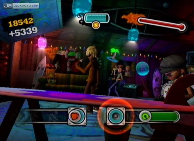 Pour ce faire, rien de tel que de passer par la case "Tutorial", celle qui permet de se familiariser avec les commandes du jeu. Bien entendu, le premier instrument vers lequel on va se diriger n’est autre que la guitare, devenue la référence universelle du jeu de musique. La Wiimote dans la main droite, le Nunchuk dans la main gauche, il ne reste plus qu’à mimer les gestes du guitariste pour pouvoir sortir des riffs de tueur. En théorie oui, en pratique, c’est une autre paire de manches. En effet, afin de varier les plaisirs et surtout les gestes à faire devant son téléviseur, les développeurs ont eu la savante idée de proposer tout un éventail de mouvements à réaliser avec ses bras, sans oublier les notes à valider avec les touches du Nunchuk. En fonction de la position de la note, le joueur doit appuyer sur les boutons C ou Z de la poire, tout en ne perdant pas de vue qu’il faut gratter la note au moment de son passage. Cela se fait bien évidemment avec la télécommande. Par moments, il faudra faire de grands cercles avec la Wiimote au lieu de gratter normalement, c’est ce qu’on appelle faire le moulinet. Un geste bien connu de certains guitaristes exhibitionnistes. Mieux, il nous est demandé parfois de croiser les bras, afin de mimer des applaudissements. Complètement absurde. C’est assez marrant – et ridicule – de prime abord, mais très vite, on se rend compte de la bêtise des mouvements qui n’ont absolument rien à voir avec le rythme de la chanson. Cette aberration, on la retrouve aussi au moment d’activer les Super-Actions, soit l’équivalent du Star Power de Guitar Hero. La foule alors en délire vous réclame des mouvements spéciaux. Ces derniers apparaissent à l’écran de manière contextuelle et il suffit de reproduire ce qu’on nous demande pour que le public devienne hystérique. Cela permet au passage de grappiller des points supplémentaires et donc de faire augmenter ses statistiques à la fin de chaque morceau.