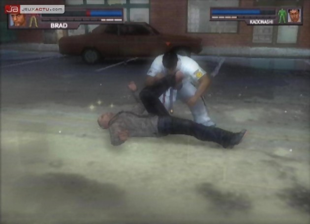 Une voix rauque, des riffs de guitare bien lourds et une mise en scène aussi kitsch que celle d’un vieux film de Jean-Claude Van Damme, la cinématique d’introduction d’Urban Reign respire le cliché américain à plein poumons. Brad Hawk, le personnage principal du jeu, n’échappe pas lui non plus à la caricature avec sa petite gueule d’amour et sa carrure d’athlète façon Schwarzenegger. En deux minutes seulement, Namco donne le ton et nous annonce la couleur : Urban Reign est un jeu de mâles développé par des mecs pour des mecs. Premier symptôme de cette surdose de testostérone : l’absence totale de scénario. Bien qu’il s’agisse d’un simple détail auquel le joueur n’apporte que peu d’intérêt, il faut reconnaître que Namco ne s’est pas franchement creusé la tête pour nous proposer une histoire qui traite une fois de plus des sempiternelles guerres de clans. Green Harbor est une ville rongée par la violence urbaine où seules les gangs de voyous et de malfrats règnent en maître. Brad, notre beau gosse des collines va se retrouver au beau milieu d’un conflit qu’il va devoir résoudre à coup de poings et autres middle kicks.