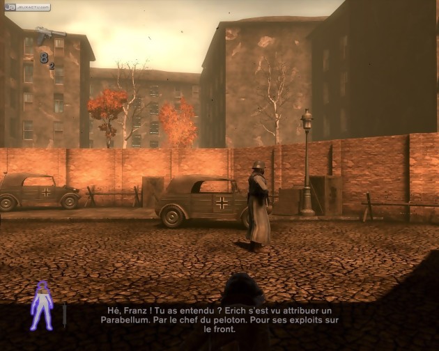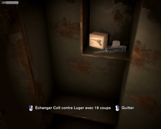 Les armoires et cabinets de toilette permettent quant à eux de se dissimuler, mais surtout de changer de vêtements dès lors qu'on récupère un uniforme SS. Dans cette nouvelle tenue, Violette peut déambuler tranquillement en pleine lumière, mais ne doit tout de même pas trop s'approcher des ennemis qui la démasqueraient aussitôt. Dans cet attirail une possibilité fondamentale manque tout de même : celle de ramasser les armes des ennemis abattus. Faisant fi de tout réalisme, les développeurs nous imposent de nous ravitailler en armement dans des casiers prévus à cet effet. Cela leur permet de nous imposer quelques passages 100% action, dont on se serait volontiers passé tant la maniabilité et l'efficacité de l'héroïne deviennent catastrophique dans ce cadre. Le dirigisme ayant ses limites, il reste heureusement permis de faire évoluer le personnage comme on le souhaite. Des objets à collectionner parsèment les niveaux, et les trouver accorde des points d'expérience. Selon sa façon de jouer, on pourra alors augmenter sur cinq degrés la durée du mode morphine, la vitesse d'approche en mode furtif, ou le nombre de coups qu'il est possible d'encaisser. Terminons ce tableau en évoquant quelques maladresses pas bien méchantes, mais tout de même regrettables, à commencer par l'irritant message "veuillez ne pas éteindre votre système" qui apparaît lors des sauvegardes automatiques. Message qui, s'il a éventuellement sa place sur console (et encore...) n'a en tout cas absolument rien à faire sur PC. La localisation aurait également mérité plus d'attention car elle nous impose un "chercher corps" au lieu de "fouiller", un "partir" en guise de "sortir", un trompeur "sauvegarde" à la place d'un plus explicite "charger sauvegarde" et, cerise moisie sur le gâteau, un "jue en pause" qui pique les yeux. Ajoutez à cela une scène finale peu claire et vous conviendrez que, aussi charmeur soit-il, la note de ce Velvet Assassin ne peut atteindre des sommets.