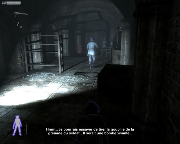 Les armoires et cabinets de toilette permettent quant à eux de se dissimuler, mais surtout de changer de vêtements dès lors qu'on récupère un uniforme SS. Dans cette nouvelle tenue, Violette peut déambuler tranquillement en pleine lumière, mais ne doit tout de même pas trop s'approcher des ennemis qui la démasqueraient aussitôt. Dans cet attirail une possibilité fondamentale manque tout de même : celle de ramasser les armes des ennemis abattus. Faisant fi de tout réalisme, les développeurs nous imposent de nous ravitailler en armement dans des casiers prévus à cet effet. Cela leur permet de nous imposer quelques passages 100% action, dont on se serait volontiers passé tant la maniabilité et l'efficacité de l'héroïne deviennent catastrophique dans ce cadre. Le dirigisme ayant ses limites, il reste heureusement permis de faire évoluer le personnage comme on le souhaite. Des objets à collectionner parsèment les niveaux, et les trouver accorde des points d'expérience. Selon sa façon de jouer, on pourra alors augmenter sur cinq degrés la durée du mode morphine, la vitesse d'approche en mode furtif, ou le nombre de coups qu'il est possible d'encaisser. Terminons ce tableau en évoquant quelques maladresses pas bien méchantes, mais tout de même regrettables, à commencer par l'irritant message "veuillez ne pas éteindre votre système" qui apparaît lors des sauvegardes automatiques. Message qui, s'il a éventuellement sa place sur console (et encore...) n'a en tout cas absolument rien à faire sur PC. La localisation aurait également mérité plus d'attention car elle nous impose un "chercher corps" au lieu de "fouiller", un "partir" en guise de "sortir", un trompeur "sauvegarde" à la place d'un plus explicite "charger sauvegarde" et, cerise moisie sur le gâteau, un "jue en pause" qui pique les yeux. Ajoutez à cela une scène finale peu claire et vous conviendrez que, aussi charmeur soit-il, la note de ce Velvet Assassin ne peut atteindre des sommets.