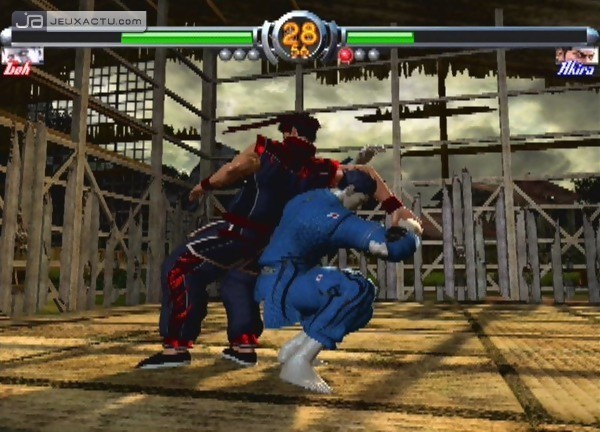 Le système de combat de Virtua Fighter 5 est aussi exigeant que celui de ses prédécesseurs, si ce n'est plus, ce qui oblige le néophyte à passer par le Dojo avant de prétendre remporter ne serait-ce qu'un round contre les habitués des salles d'arcade. Bien évidemment, un apprentissage intensif du glossaire de Virtua Fighter est indispensable pour déchiffrer et exécuter correctement les commandes. Si certaines notions comme le recovering, le buffering ou le dash se retrouvent dans la plupart des jeux de baston, d'autres sont propres à la série, notamment celle de l'avantage et du désavantage. Explications : lorsque vous donnez un coup à votre adversaire et que celui-ci est touché, vous prenez l'avantage sur lui. Vous pouvez l'attaquer de nouveau sans que ce dernier puisse réellement contre-attaquer. Par contre, si vous attaquez et que votre adversaire bloque votre coup, vous êtes en situation de désavantage, et il obtient la priorité pour l'attaque suivante. Dans ce cas, il vaut mieux adopter une attitude défensive et se protéger au lieu de s'obstiner à attaquer. Pour les plus bourrins, il est sans doute nécessaire de rappeler que le fait de vouloir frapper sans avoir pris l'avantage favorise les counter hits. Ces coups reçus au moment où l'on est sur le point de frapper infligent nettement plus de dommages qu'une attaque classique. D'aucuns affirmeront que la doublette avantage-désavantage est appliquée dans pas mal de fighting games, mais c'est bel et bien dans Virtua Fighter qu'elle trouve ses origines. Par ailleurs, l'expérience acquise au fil des combats permet de passer outre les règles de base, et de découvrir d'autres concepts encore plus subtils comme le reverse nitaku. A coté de ça, les commandes de Virtua Fighter 5 reposent sur trois boutons de base - pied, poing, garde - qu'il faut combiner pour sortir des combos dévastateurs. A l'instar d'un Dead Or Alive ou d'un Tekken, les launchers permettent d'amorcer des enchaînements de quatre voire cinq coups pour les plus efficaces, sans compter les possibilités infinies offertes par les wall combos. Là encore, le Dojo est l'endroit idéal pour examiner les coups qui s'imbriquent parfaitement les uns dans les autres tout en infligeant le maximum de dommages. L'efficacité des mix-up dépend beaucoup de la connaissance des coups des persos.