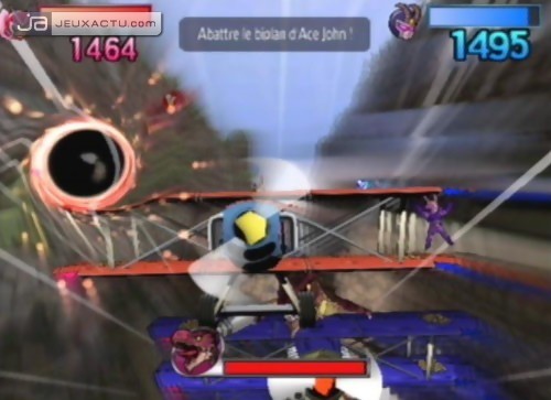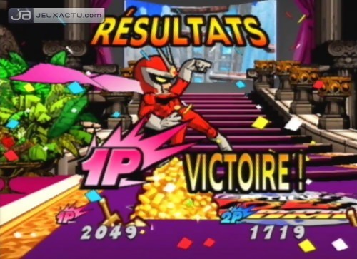 Lorsque l'on a passé des nuits entières sur Super Smash Bros. Melee, il est difficile de ne pas avoir un minimum d'exigeance en terme de gameplay. A notre goût, l'erreur fatale commise par Clover Studio dans la configuration de la manette, c'est le combo stick analogique vers le bas+A (ou +B) pour descendre d'un étage. Peu embêtant durant les premières minutes de jeu, il devient rapidement insupportable dans la récupération d'items et dans certaines missions de jumping. Il aurait été préférable d'utiliser un système de double-pression du stick, beaucoup plus efficace et surtout plus précis. A l'instar du titre de HAL Laboratory, chaque direction donnée au stick conjuguée à B ou Y confère une attaque différente. Du coté des attaques spéciales via X, certaines s'avèrent très efficaces pour atteindre les ennemis grâce à une allonge généreuse. On pense notamment au lightning blade d'Alastor ou au blue thunder de Capitaine Blue. Utilisables à l'infini, ces mouvements spéciaux ont le désavantage de noyer rapidement les combats dans du bourrinage à tout va. Les VFX Powers offrent l'occasion de retrouver quelques plaisirs découverts avec le Viewtiful Joe originel. Le mach speed embrase le joueur, ce qui lui permet d'aller brûler tous les adversaires aux quatre coins de l'écran à la vitesse de la lumière. Le zoom double la taille du joueur, ce qui décuple ses attaques et leur portée; plusieurs ennemis peuvent être touchés avec une seule claque; la classe ! Les sound effects sont sans doute les moins intéressants de la liste. En maintenant L ou R (quatre niveaux de puissance au total), les sons se matérialisent et des blocs sonores plus ou moins gros et plus ou moins puissants sont balancés sur les acteurs adverses. Pour finir, le fameux slow qui ralentit tous les personnages présents à l'écran, ce qui alloue à son propriétaire une priorité absolue sur toutes les attaques. Outre les VFX Powers, les VFX Battles, sorte de mini-jeux dans le combat dans lesquels sont aspirés tous les combattants, pimentent également les parties. A l'image d'un Mario Party, le but de ces affrontements atemporels est de voler le plus d'écus V à l'adversaire. Il en existe plusieurs types : button smash, round & round, timing battle, rallye battle et quick draw. Button smash et round & round s'adresse plutôt aux adeptes de Track & Field puisque l'on doit appuyer le plus rapidement possible sur tous les boutons et faire tournoyer comme un malade les deux sticks de la manette. L'ensemble reste très basique, mais bougrement stressant lorsque l'on a un certain pécule à défendre; surtout dans les épreuves nécessitant un bon timing.