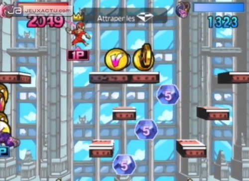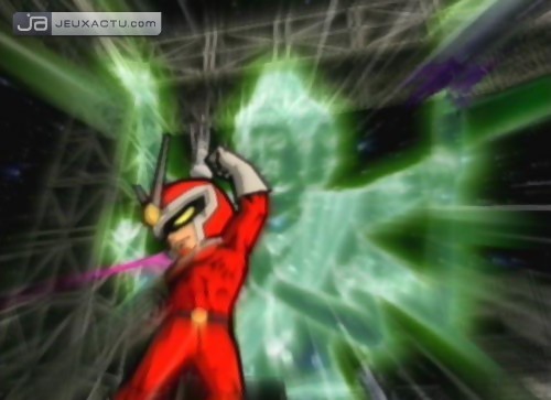 Lorsque l'on a passé des nuits entières sur Super Smash Bros. Melee, il est difficile de ne pas avoir un minimum d'exigeance en terme de gameplay. A notre goût, l'erreur fatale commise par Clover Studio dans la configuration de la manette, c'est le combo stick analogique vers le bas+A (ou +B) pour descendre d'un étage. Peu embêtant durant les premières minutes de jeu, il devient rapidement insupportable dans la récupération d'items et dans certaines missions de jumping. Il aurait été préférable d'utiliser un système de double-pression du stick, beaucoup plus efficace et surtout plus précis. A l'instar du titre de HAL Laboratory, chaque direction donnée au stick conjuguée à B ou Y confère une attaque différente. Du coté des attaques spéciales via X, certaines s'avèrent très efficaces pour atteindre les ennemis grâce à une allonge généreuse. On pense notamment au lightning blade d'Alastor ou au blue thunder de Capitaine Blue. Utilisables à l'infini, ces mouvements spéciaux ont le désavantage de noyer rapidement les combats dans du bourrinage à tout va. Les VFX Powers offrent l'occasion de retrouver quelques plaisirs découverts avec le Viewtiful Joe originel. Le mach speed embrase le joueur, ce qui lui permet d'aller brûler tous les adversaires aux quatre coins de l'écran à la vitesse de la lumière. Le zoom double la taille du joueur, ce qui décuple ses attaques et leur portée; plusieurs ennemis peuvent être touchés avec une seule claque; la classe ! Les sound effects sont sans doute les moins intéressants de la liste. En maintenant L ou R (quatre niveaux de puissance au total), les sons se matérialisent et des blocs sonores plus ou moins gros et plus ou moins puissants sont balancés sur les acteurs adverses. Pour finir, le fameux slow qui ralentit tous les personnages présents à l'écran, ce qui alloue à son propriétaire une priorité absolue sur toutes les attaques. Outre les VFX Powers, les VFX Battles, sorte de mini-jeux dans le combat dans lesquels sont aspirés tous les combattants, pimentent également les parties. A l'image d'un Mario Party, le but de ces affrontements atemporels est de voler le plus d'écus V à l'adversaire. Il en existe plusieurs types : button smash, round & round, timing battle, rallye battle et quick draw. Button smash et round & round s'adresse plutôt aux adeptes de Track & Field puisque l'on doit appuyer le plus rapidement possible sur tous les boutons et faire tournoyer comme un malade les deux sticks de la manette. L'ensemble reste très basique, mais bougrement stressant lorsque l'on a un certain pécule à défendre; surtout dans les épreuves nécessitant un bon timing.