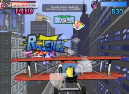 Injouables parce qu'il est impossible de discerner quoi que ce soit, ou presque. Pourtant, la qualité visuelle du jeu n'est absolument pas à remettre en question : graphismes colorés, level design de bonne facture avec des niveaux intéractifs, animation des personnages huilée, 2D et 3D toujours aussi synchros. En fait, c'est le style cel-shaded made in Viewtiful Joe qui semble avoir du mal à s'adapter au melee. La multiplication d'effets artificieux à l'écran qui épataient la rétine en scrolling horizontal l'endolorit cette fois-ci. Viewtiful Joe : Red Hot Rumble veut tellement bien faire qu'il surcharge l'écran au lieu de proposer un champ visuel dégagé. Il arrive même que l'on matraque la manette comme un demeuré en croyant achever un adversaire, et on se rend compte au bout de quelques secondes que son personnage se retrouve à l'autre bout de l'écran, en train de taper dans le vide, à deux doigts de tomber dans le ravin. Charmant. Du coup, on passe le plus clair de son temps à faire attention où l'on met les pieds au lieu d'attaquer les autres joueurs. A quatre, les parties deviennent un véritable enfer !