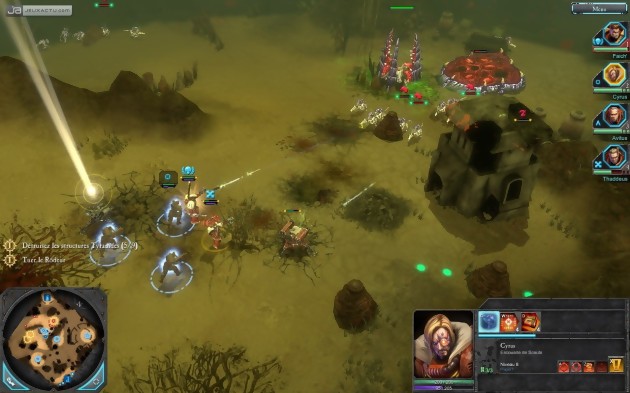 La campagne solo est construite autour des exploits de quelques Space Marines placés sous la houlette de Davian Thule et menés, sur le terrain, par un commandant d’armée baptisé par vos soins. Un gigantesque essaim de tyranides, êtres visqueux et innombrables, proches cousins d’Alien, menace la zone de recrutement du chapitre des Blood Ravens, auquel vous appartenez. L’invasion est d’autant plus difficile à contenir qu’elle a plusieurs visages. Les perfides Eldars et les Orks idiots s’invitent en effet sur le champ de bataille, les premiers manipulant les seconds. Pour protéger les trois planètes du secteur, le stratège que vous êtes doit procéder à des choix. La campagne est divisée en jours, et vous ne pouvez mener qu’une seule mission à bien durant cette journée, sachant évidemment que plusieurs affectations vous sont proposées en permanence (à l’exception de quelques tâches à mener dans un délai, vous aurez toutefois toujours le temps de faire tout ce qu’on attend de vous). Vous choisissez votre prochain objectif depuis une carte stratégique et en fonction de vos objectifs et de votre niveau d’expérience et, avant de vous lancer, formez votre équipe en choisissant parmi tous les héros disponibles. Une fois votre sélection opérée, vous validez et c’est parti pour la guerre, la vraie. Chaque assaut sur le terrain s’ouvre sur une même scène : votre capsule de débarquement s’écrase à la surface, et vos hommes en jaillissent, armes en main, prêts à tuer tout ce qui passe à leur portée. Une introduction brutale, à l’image des minutes suivantes. Dans Dawn of War II, ça tranche, ça charcute, ça saigne, ça explose, et ça meurt, le tout dans une belle cacophonie et un déluge de petites animations violentes. La licence veut ça. Monde futuriste entièrement bâti sur l’art de la guerre et les conflits inter-espèces, Warhammer 40 000 met en scène une humanité conquérante, qui fait face à l’adversité à l’aide d’instruments majoritairement mécaniques. Fusils lourds, exosquelettes monstrueux, armures de combat ultra-blindées, aéronefs métalliques, l’électronique de pointe et les matériaux trop exotiques ne sont pas vraiment prisés des cohortes de Space Marines. Ceux-là ne peuvent prétendre à la gloire qu’au terme d’actes héroïques impliquant si possible une situation totalement désespérée et des milliers d’opposants. Les conflits de ce Dawn of War II ont toutefois une ampleur moindre, puisqu’ils n’impliquent que quatre héros, soit rarement plus de dix unités alliées à l’écran (certains peuvent en effet être accompagnés de deux ou trois recrues), et que celles-ci n’affrontent jamais plus d’une grosse centaine de soldats.