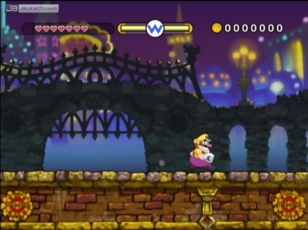 Si cette réalisation est un exemple à suivre, le gameplay et l’utilisation de la Wiimote devraient également servir de tuteur à d’autres titres qui voient le jour sur Wii. Plate-forme 2D oblige, Wario Land : The Shake Dimension se doit de suivre quelques codes bien établis afin de ne pas trahir sa propre condition. Ce n’est pas une surprise et encore moins une surprise que la progression se fait principalement dans le sens de lecture, de la gauche vers la droite. Un scrolling horizontal avec lequel les joueurs trentenaires ont grandi dans les années 80 et 90, et qui parvient toujours à faire son petit effet. Pour mener à bien sa mission, Wario dispose de ses propres capacités physiques, c’est-à-dire pas grand-chose dans l’absolu. Mais grâce à ses grosses fesses et à son abdomen imposant, notre héros est capable de renvoyer le plus cruel des Boss dans sa dimension. La Wiimote tenue à l’horizontale, le joueur peut faire faire à Wario toutes sortes d’acrobaties improbables.