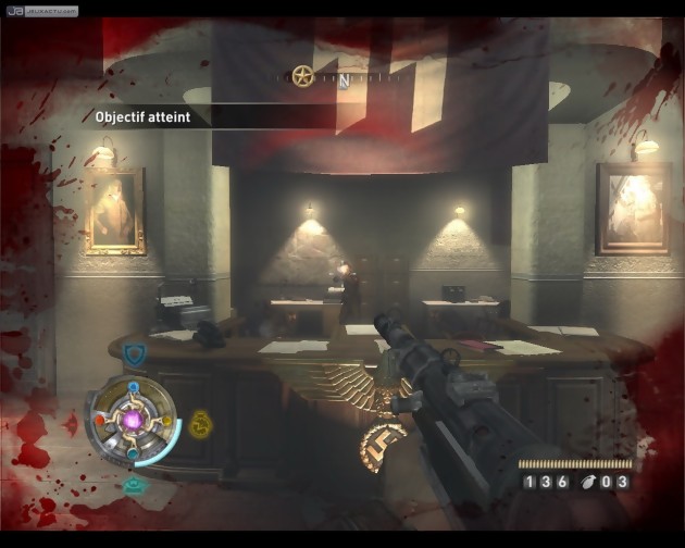 Qui dit Wolfenstein, dit savoureux mélange entre Troisième Reich et sciences occultes. Ce nouvel épisode n'échappe pas à la règle et nous propose donc une bonne ambiance de série B, où se côtoient méchants nazis et hideux démons. En tant que soldat des services secrets britanniques, votre rôle consiste bien entendu à éliminer tant les uns que les autres. En revanche il n'est plus permis de détruire tous les symboles nazis que l'on croise sur son chemin (portraits d'Hitler, affiches de propagande, drapeaux à Svastika...) comme on avait coutume de le faire dans l'épisode précédent. Cette régression anecdotique, mais tout de même bien réelle, se voit heureusement largement compensée par une nouveauté de taille : le héros ne se contente plus d'affronter le surnaturel, il sait également en tirer profit. Un antique médaillon trouvé sur un chantier de fouilles lui octroie de puissants pouvoirs. Le premier d'entre eux permet de basculer instantanément dans "le voile", une dimension parallèle à la nôtre grâce à laquelle on voit les choses sous un autre angle. Cette vision alternative de la réalité, représentée à l'écran par des couleurs bleutées, rend phosphorescents les ennemis, les bidons explosifs et quelques autres éléments clés, qui deviennent donc facilement repérables, même dans le noir. De plus, on se rend compte que l'atmosphère qu'on croyait vide de toute présence quelques instants plus tôt est en vérité peuplée de créatures volantes peu ragoutantes. Tant qu'on ne les cherche pas trop, ces dernières ne sont heureusement guère offensives. A l'occasion, on se permettra donc d'en abattre quelques unes afin de générer des arcs électriques susceptibles de blesser les ennemis alentours. Le voile permet également de découvrir quelques passages secrets dissimulés dans des murs pourtant bien solides. Tous ces avantages restent de mise avec les autres pouvoirs qui, en contrepartie, consomment beaucoup plus rapidement l'énergie du médaillon. Il faut dire que du bouclier énergétique au ralentissement du temps, en passant par l'ultra-puissance, ils offrent des avantages presque indécents.