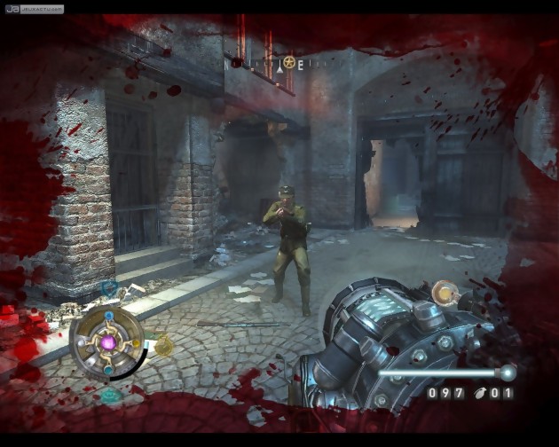 Qui dit Wolfenstein, dit savoureux mélange entre Troisième Reich et sciences occultes. Ce nouvel épisode n'échappe pas à la règle et nous propose donc une bonne ambiance de série B, où se côtoient méchants nazis et hideux démons. En tant que soldat des services secrets britanniques, votre rôle consiste bien entendu à éliminer tant les uns que les autres. En revanche il n'est plus permis de détruire tous les symboles nazis que l'on croise sur son chemin (portraits d'Hitler, affiches de propagande, drapeaux à Svastika...) comme on avait coutume de le faire dans l'épisode précédent. Cette régression anecdotique, mais tout de même bien réelle, se voit heureusement largement compensée par une nouveauté de taille : le héros ne se contente plus d'affronter le surnaturel, il sait également en tirer profit. Un antique médaillon trouvé sur un chantier de fouilles lui octroie de puissants pouvoirs. Le premier d'entre eux permet de basculer instantanément dans "le voile", une dimension parallèle à la nôtre grâce à laquelle on voit les choses sous un autre angle. Cette vision alternative de la réalité, représentée à l'écran par des couleurs bleutées, rend phosphorescents les ennemis, les bidons explosifs et quelques autres éléments clés, qui deviennent donc facilement repérables, même dans le noir. De plus, on se rend compte que l'atmosphère qu'on croyait vide de toute présence quelques instants plus tôt est en vérité peuplée de créatures volantes peu ragoutantes. Tant qu'on ne les cherche pas trop, ces dernières ne sont heureusement guère offensives. A l'occasion, on se permettra donc d'en abattre quelques unes afin de générer des arcs électriques susceptibles de blesser les ennemis alentours. Le voile permet également de découvrir quelques passages secrets dissimulés dans des murs pourtant bien solides. Tous ces avantages restent de mise avec les autres pouvoirs qui, en contrepartie, consomment beaucoup plus rapidement l'énergie du médaillon. Il faut dire que du bouclier énergétique au ralentissement du temps, en passant par l'ultra-puissance, ils offrent des avantages presque indécents.