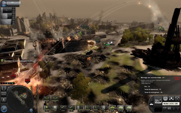 World in Conflict ne s'embarrasse pas de détails. La guerre, c'est pas pour les chochottes, et les meilleurs assauts sont ceux qui impliquent une poignée de tanks lourds et quelques batteries d'artillerie qui pilonnent à distance les positions ennemies. La composition de votre armée est assez sommaire, puisque vous ne pouvez piocher que dans 20 unités différentes... et avez intérêt à le faire avec bon sens. L'aspect de micro-management inhérent au genre est en effet ici partiellement absent, puisque vous ne pouvez construire de base ou entraîner directement vos hommes, qui sont parachutés par l'aviation. Ces demandes vous coûtent toutefois des points de renfort, que vous obtenez en prenant et en fortifiant différents points de contrôle répartis sur chaque carte. Bonne nouvelle, dès que vous perdez un groupe d'hommes ou un véhicule, les points de renfort qu'ils vous ont coûtés vous sont réattribués, et vous ne serez pas contraint à l'abandon à la première erreur tactique. Vous ne serez toutefois jamais largement pourvu en points, et votre groupe d'attaque ne dépassera pas, du moins durant la campagne solo, la quinzaine d'unités. Ce système de points a le grand mérite de vous inciter à aller sans arrêt de l'avant, à vous pousser vers l'ennemi. S'il est toujours possible de camper, le flot a priori intarissable des blindés et unités soviétiques, qui vous harcèlent tant que vous n'avez pas pris une position-clé, vous contraindra à aller au-devant des ennuis. Pour accentuer ce sentiment d'urgence, bien des missions du mode solo sont chronométrées, et la plupart des objectifs secondaires doivent être complétés rapidement. Extrêmement nerveuse, l'action perd du coup beaucoup en finesse.