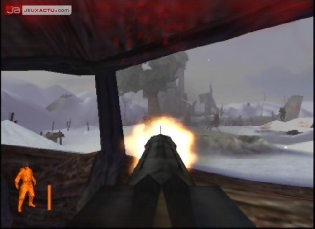 Les FPS sur consoles sont rarement des réussites en terme de gameplay, pour un Halo, combien de jeux ratés au maniement approximatif ? Dans ce domaine, World War Zero s’en sort plutôt bien grâce à une disposition des touches plutôt bien pensée, un maniement du personnage correct et un système de lock semi automatique qui vient améliorer le manque de précision des sticks analogiques par rapport au couple clavier/souris. Seul petit souci, pour les amateurs de challenges longs et relevés, l’utilisation du lock rend le jeu facile, voire très facile si bien qu’on peut le finir en deux ou trois après midi sans périr plus de quatre ou cinq fois en mode normal… Il est bien possible de le désactiver mais cela a un côté frustrant du fait du manque de précision que cela entraîne. Les points de sauvegarde étant nombreux, les munitions disponibles à foison et les kits de santé au diapason, il suffit bien souvent de rentrer dans le tas sans faire de chichi en comptant sur le lock pour viser les ennemis. Le jeu comportant pas mal de phases avec des lieux fermés (tranchées, couloirs,…), son intérêt s’amoindrit alors largement lors de la traversée de ces lieux où l’utilisation des armes automatiques est dévastateur. Dans les espaces ouverts, par contre, on appréciera la puissance du zoom en mode sniper, que ce soit au fusil ou au lance-roquettes. Votre arsenal est d’ailleurs assez bien fourni avec un lance-flammes ou encore un mini-canon jouissifs. Petite subtilité de gameplay, vous avez en permanence deux armes sur vous avec la possibilité de passer très rapidement de l’une à l’autre. Contrairement à Halo, vous pouvez par contre toutes les avoir sur le dos. Autre idée d’Halo absente, malheureusement pour celle-ci, il n’y a pas de touche affectée à l’envoi de grenades si bien que leur utilisation bien trop fastidieuse n’en fait pas une arme de choix. Dommage car la possibilité d’envoyer des grenades hallucinogènes qui troublent les sens était bien pensée. Il suffit d’ailleurs de passer sur une mine de ce type pour constater les effets que cela engendre, vos commandes étant inversées et le champ de vision déformé.