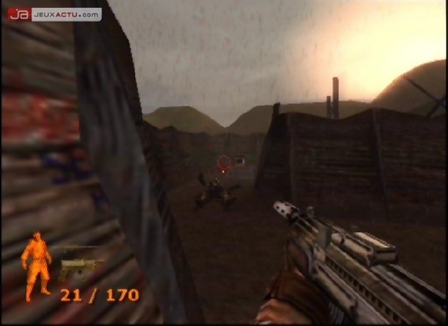 Les FPS sur consoles sont rarement des réussites en terme de gameplay, pour un Halo, combien de jeux ratés au maniement approximatif ? Dans ce domaine, World War Zero s’en sort plutôt bien grâce à une disposition des touches plutôt bien pensée, un maniement du personnage correct et un système de lock semi automatique qui vient améliorer le manque de précision des sticks analogiques par rapport au couple clavier/souris. Seul petit souci, pour les amateurs de challenges longs et relevés, l’utilisation du lock rend le jeu facile, voire très facile si bien qu’on peut le finir en deux ou trois après midi sans périr plus de quatre ou cinq fois en mode normal… Il est bien possible de le désactiver mais cela a un côté frustrant du fait du manque de précision que cela entraîne. Les points de sauvegarde étant nombreux, les munitions disponibles à foison et les kits de santé au diapason, il suffit bien souvent de rentrer dans le tas sans faire de chichi en comptant sur le lock pour viser les ennemis. Le jeu comportant pas mal de phases avec des lieux fermés (tranchées, couloirs,…), son intérêt s’amoindrit alors largement lors de la traversée de ces lieux où l’utilisation des armes automatiques est dévastateur. Dans les espaces ouverts, par contre, on appréciera la puissance du zoom en mode sniper, que ce soit au fusil ou au lance-roquettes. Votre arsenal est d’ailleurs assez bien fourni avec un lance-flammes ou encore un mini-canon jouissifs. Petite subtilité de gameplay, vous avez en permanence deux armes sur vous avec la possibilité de passer très rapidement de l’une à l’autre. Contrairement à Halo, vous pouvez par contre toutes les avoir sur le dos. Autre idée d’Halo absente, malheureusement pour celle-ci, il n’y a pas de touche affectée à l’envoi de grenades si bien que leur utilisation bien trop fastidieuse n’en fait pas une arme de choix. Dommage car la possibilité d’envoyer des grenades hallucinogènes qui troublent les sens était bien pensée. Il suffit d’ailleurs de passer sur une mine de ce type pour constater les effets que cela engendre, vos commandes étant inversées et le champ de vision déformé.