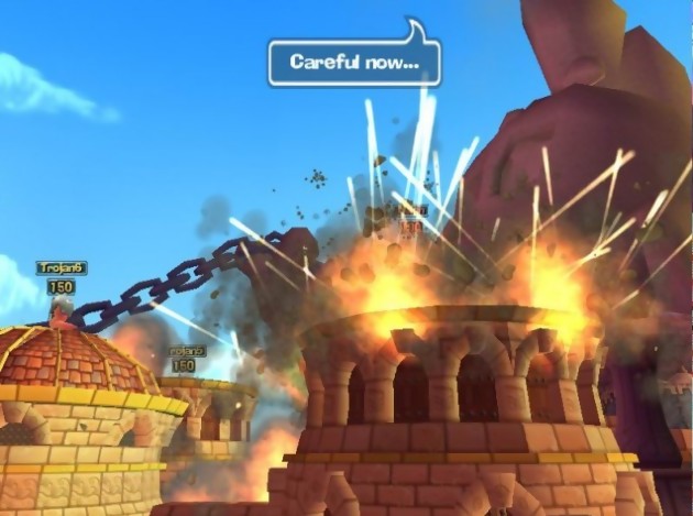 Ce n’est désormais plus une, mais trois manières différentes qui vous permettront de prendre l’avantage définitif sur vos adversaires. Si la destruction de l’armée ennemie reste toujours d’actualité, l’apport de stratégie avec la construction de bâtiments et d’une cité forte marque le réel tournant de la série, et ouvre surtout de nouveaux horizons en terme de gameplay. Chaque tour se décompose alors en deux parties : une étape de construction et une étape où vous pourrez enfin attaquer. Vous commencez la partie avec un QG, véritable cœur de votre cité, c’est également votre point sensible puisque sa destruction annonce la fin de la partie, au même égard que celle de vos chers êtres roses. A vous donc de le protéger comme il se doit. Pour se faire, vous disposez de bâtiments, si ces derniers servent à l’origine pour attaquer les vers et la base adverse, ils se révèlent être de bons pare-feux pour compliquer l’accès à votre QG. De plus, chaque zone dispose de points stratégiques, représentés par des étoiles, qui vous permettront d’accéder à de nouvelles constructions, plus résistantes mais aussi et surtout plus puissantes. Chacun de ces bâtiments offre alors son propre lot d’armes, avec au programme toute une ribambelle de gadgets plus débiles les uns que les autres. De la classique vieille femme explosive au pigeon voyageur, en passant désormais par le super-hippo (entendez par là un hippopotame propulsé par une fusée attachée sur le dos), ou le Chili-con-Carnage (un mexicain endormi sous son sombrero). On trouvera également des armes de destruction massive comme la mitrailleuse lourde ou le laser des plus efficaces pour traverser les rangs ennemis. D’autres bâtiments comme l’hôpital, le centre de recherches ou la fabrique d’armes pourront enfin marquer la différence dans votre approche stratégique, en vous permettant de ressusciter vos vers ou en réalisant des armes qui causeront plus de dégâts.