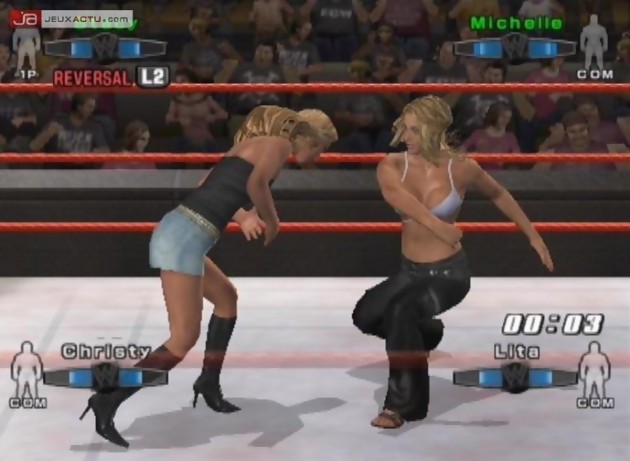 Les graphismes du jeu sont irréprochables et permettent facilement de reconnaître tous les lutteurs et divas présents dans le jeu, leur somme avoisinant la soixantaine. Divisés entre les lutteurs de Raw, emmenés par leur champion actuel, John Cena, et le champion de Smackdown, Dave Batista, vous pourrez également mettre la main sur les personnages les plus charismatiques de la WWE que sont TripleH , The Undertaker , Edge ou encore Kane et le Big Show ; certaines légendes vivantes ou passées de la WWE seront à débloquer parmi lesquelles André le géant ou Hulk Hogan en version années 80. Mais que serait WWE Smackdown ! VS Raw 2006 sans son lot de Divas, les fameuses demoiselles qui sévissent dans la WWE ! Ce jeu va vous permettre de mettre la main (virtuellement) sur Trish Stratus, Lita ou encore Torrie Wilson dans des combats où l’objectif sera de laisser votre adversaire en sous-vêtements (Bra & Panties Match). Subitement, j’aperçois déjà chez quelques uns un regain d’intérêt pour les jeux de catch. La jouabilité est exemplaire avec une bonne mise en place des boutons du pad de la PlayStation 2, même s’il faudra un petit temps d’apprentissage afin de comprendre et affiner les prises au corps et les prises de soumissions. C’est alors un pur plaisir que de déplacer son lutteur dans les quatre coins du ring. Le système de jauge à remplir vous permettra d’effectuer après manipulation du pad le fameux finish move de chaque lutteur afin de vous faciliter la victoire.