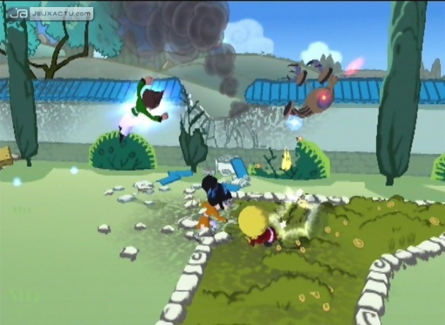 Si le jeu démarre sur un combat légendaire entre un puissant maître en arts martiaux et une sorcière aux pouvoirs démoniaques, le scénario de Xiaolin Showdown est certainement l’aspect sur lequel on s’attardera le moins, quand bien même les amateurs du dessin animé retrouveront Omi et ses trois compères, Kimiko, Raymondo et Clay, chargés de protéger des objets sacrés et faire ainsi régner le Bien sur la terre. Une histoire somme toute classique donc mais qui a le mérite de suivre à la lettre celle de la série animée. Reprenant le concept des jeux de combat à plusieurs façon Super Smash Bros. Melee ou Kung Fu Chaos, Xiaolin Showdown permet à 4 joueurs de s’affronter sur une arène fermée. Si en mode solo, le but est d’éliminer les ennemis envoyés par le méchant Jack Spicer à l’aide de ses amis contrôlés au choix par un ou plusieurs camarades ou le CPU, l’objectif diffère quelque peu lorsqu’on passe au mode "Showdown", l’équivalent d’un mode multijoueur. Chaque zone de combat est ponctuée par la présence d’objets et divers items avec lesquels le joueur peut interagir. Jarres, orbes de pouvoirs, boules de santé, on nage en terrain connu, ce qui n’est pas forcément un atout majeur pour un challenger qui tente désespérément de se démarquer de l’ombre des grands. Ce n’est peut-être pas l’intérêt voulu mais toujours est-il que les arènes pu inspirés n’aident pas Xiaolin Showdown à proposer un univers captivant. Côté combats, le nombre de coups et autres attaques s’avèrent bien trop limités pour varier les plaisirs et le manque de précision dans les coups ne fait qu’accentuer le sentiment de frustration pour un titre s’adressant à un jeune public. Reste alors une réalisation correcte et fidèle au dessin animé, grâce notamment à l’utilisation du cel-shading, bien qu’on aurait aimé un peu plus de variété et d’originalité dans les niveaux proposés.